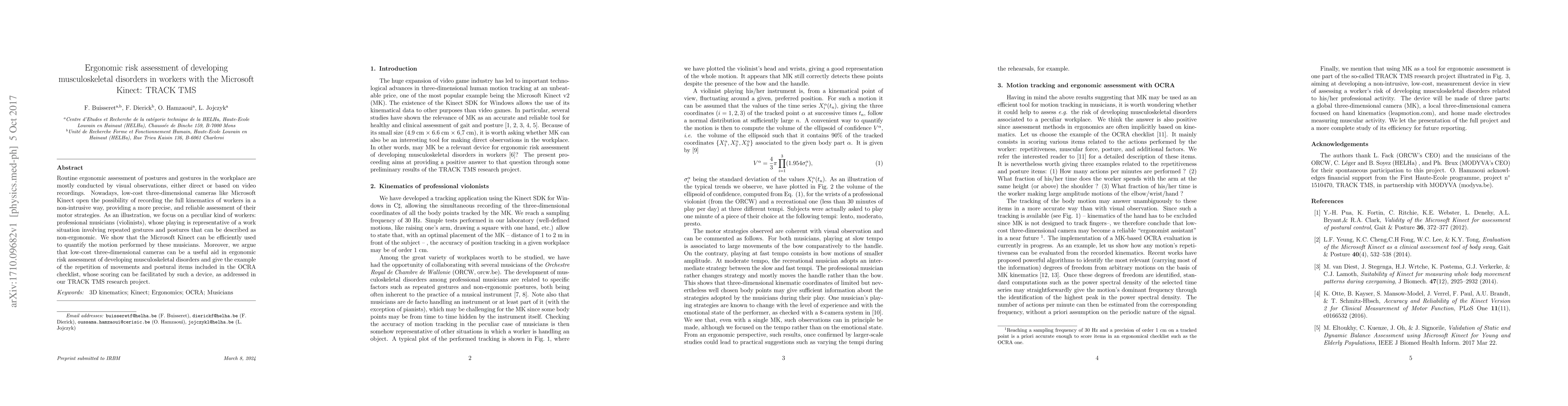 Routine ergonomic assessment of postures and gestures in the workplace are mostly conducted by visual observations, either direct or based on video recordings. Nowadays, low-cost three-dimensional cameras like Microsoft Kinect open the possibility of recording the full kinematics of workers in a non-intrusive way, providing a more precise, and reliable assessment of their motor strategies. As an illustration, we focus on a peculiar kind of workers: professional musicians (violinists), whose playing is representative of a work situation involving repeated gestures and postures that can be described as non-ergonomic. We show that the Microsoft Kinect can be efficiently used to quantify the motion performed by these musicians. Moreover, we argue that low-cost three-dimensional cameras can be a useful aid in ergonomic risk assessment of developing musculoskeletal disorders and give the example of the repetition of movements and postural items included in the OCRA checklist, whose scoring can be facilitated by such a device, as addressed in our TRACK TMS research project.