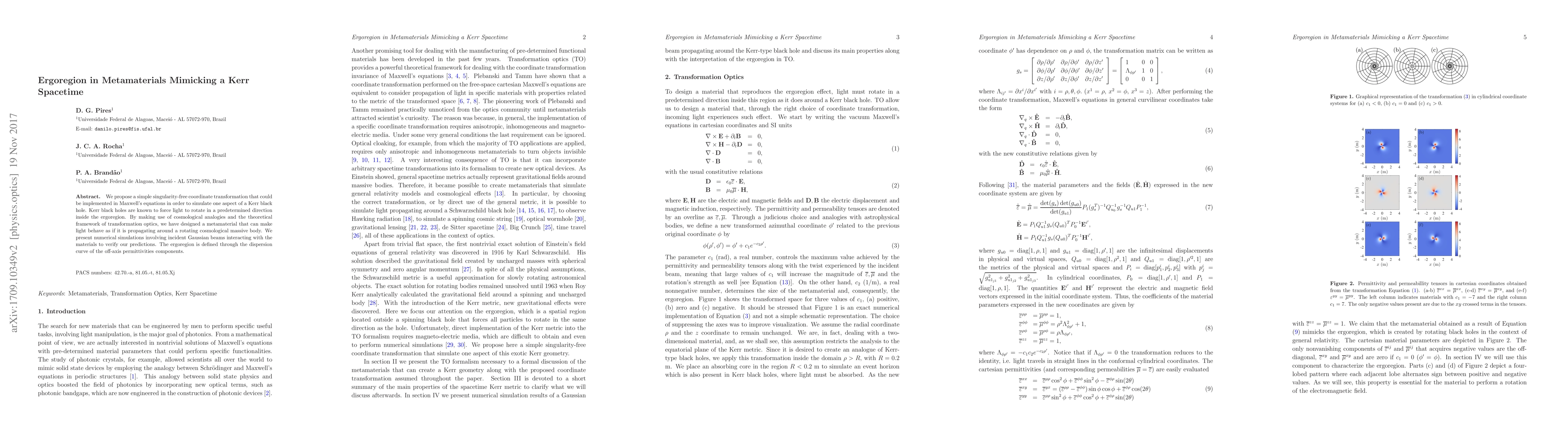 We propose a simple singularity-free coordinate transformation that could be implemented in Maxwell's equations in order to simulate one aspect of a Kerr black hole. Kerr black holes are known to force light to rotate in a predetermined direction inside the ergoregion. By making use of cosmological analogies and the theoretical framework of transformation optics, we have designed a metamaterial that can make light behave as if it is propagating around a rotating cosmological massive body. We present numerical simulations involving incident Gaussian beams interacting with the materials to verify our predictions. The ergoregion is defined through the dispersion curve of the off-axis permittivities components.