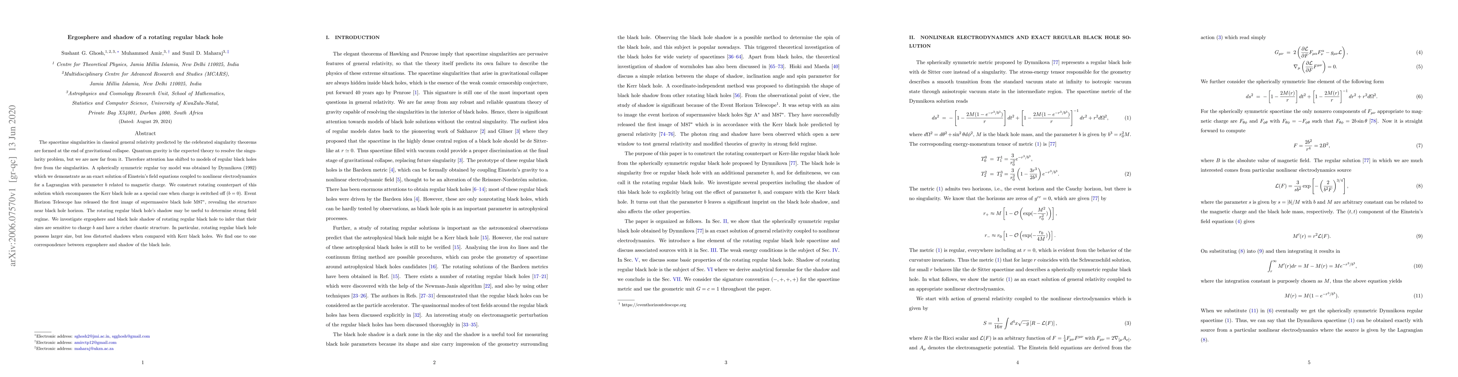 The spacetime singularities in classical general relativity predicted by the celebrated singularity theorems are formed at the end of gravitational collapse. Quantum gravity is the expected theory to resolve the singularity problem, but we are now far from it. Therefore attention has shifted to models of regular black holes free from the singularities. A spherically symmetric regular toy model was obtained by Dymnikova (1992) which we demonstrate as an exact solution of Einstein's field equations coupled to nonlinear electrodynamics for a Lagrangian with parameter $b$ related to magnetic charge. We construct rotating counterpart of this solution which encompasses the Kerr black hole as a special case when charge is switched off ($b=0$). Event Horizon Telescope has released the first image of supermassive black hole M87$^*$, revealing the structure near black hole horizon. The rotating regular black hole's shadow may be useful to determine strong field regime. We investigate ergosphere and black hole shadow of rotating regular black hole to infer that their sizes are sensitive to charge $b$ and have a richer chaotic structure. In particular, rotating regular black hole possess larger size, but less distorted shadows when compared with Kerr black holes. We find one to one correspondence between ergosphere and shadow of the black hole.