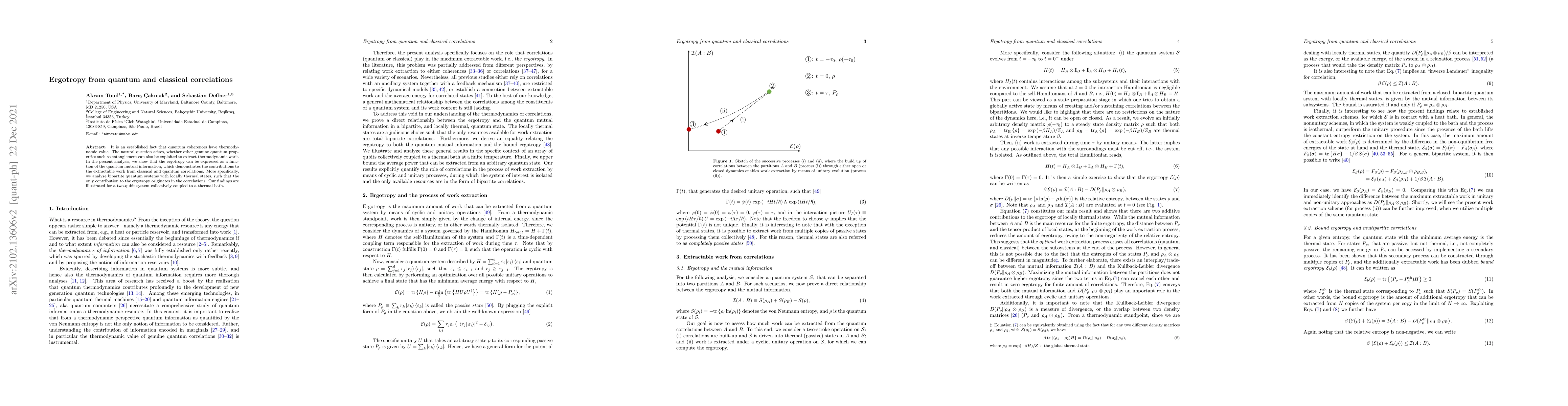 This research reveals that ergotropy, a measure of extractable work in thermodynamics, can be expressed using quantum mutual information, highlighting contributions from both classical and quantum correlations. The study focuses on bipartite quantum systems with locally thermal states, exemplified through a two-qubit system interacting with a thermal bath.