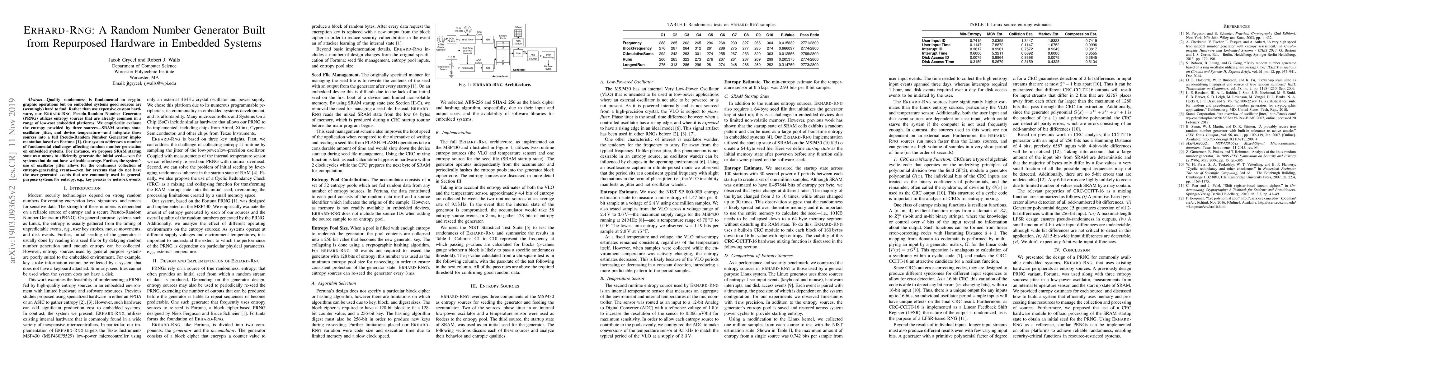 ERHARD-RNG is a cost-effective PRNG for embedded systems that leverages common hardware sources like SRAM startup state, oscillator jitter, and device temperature for entropy. It addresses challenges in random number generation on such systems by providing efficient initial seed generation and continuous entropy collection.