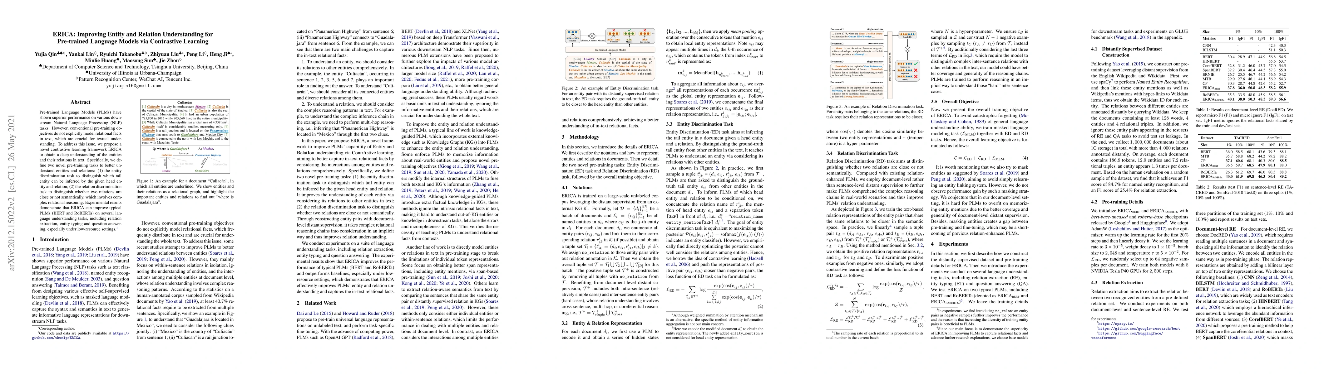 ERICA introduces a contrastive learning framework to enhance pre-trained Language Models' understanding of entities and their relations in text. It employs two pre-training tasks: entity discrimination and relation discrimination, leading to improved performance on tasks like relation extraction and question answering.