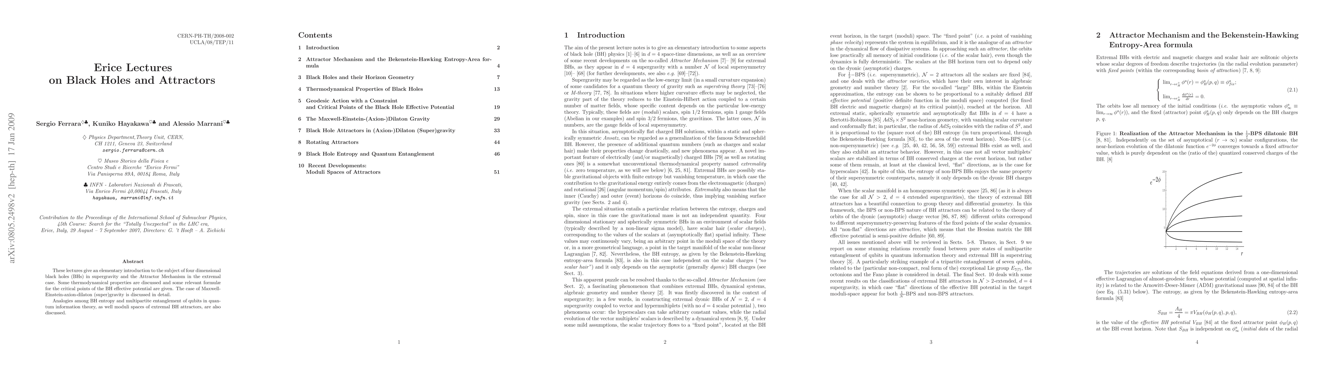 This paper provides an accessible introduction to four-dimensional black holes in supergravity, focusing on the Attractor Mechanism and thermodynamic properties. It also explores detailed formulae for black hole effective potentials and discusses analogies between black hole entropy and quantum information theory.