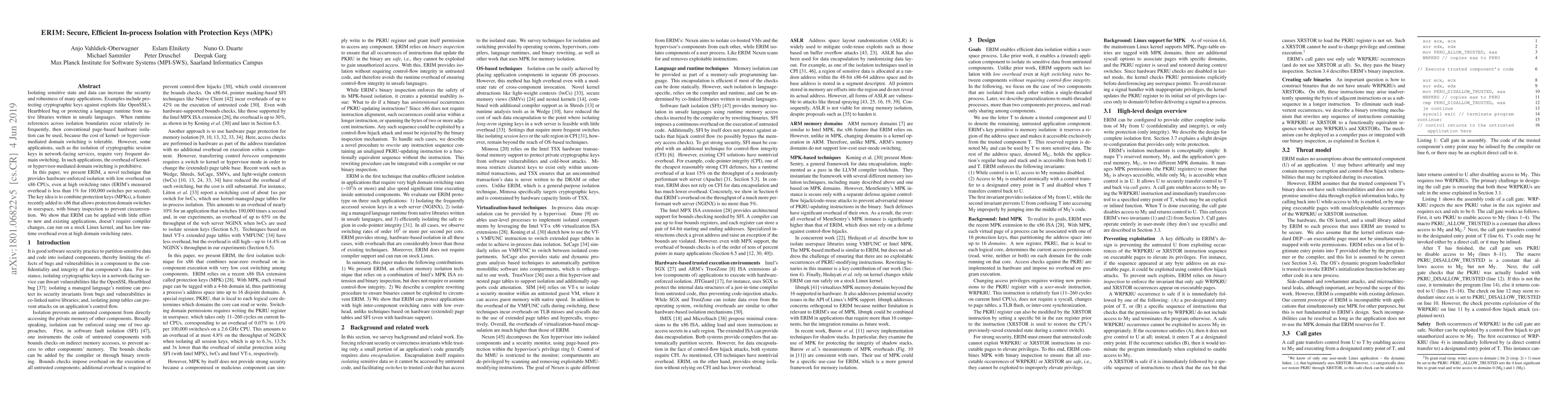 Isolating sensitive state and data can increase the security and robustness of many applications. Examples include protecting cryptographic keys against exploits like OpenSSL's Heartbleed bug or protecting a language runtime from native libraries written in unsafe languages. When runtime references across isolation boundaries occur relatively infrequently, then conventional page-based hardware isolation can be used, because the cost of kernel- or hypervisor-mediated domain switching is tolerable. However, some applications, such as the isolation of cryptographic session keys in network-facing services, require very frequent domain switching. In such applications, the overhead of kernel- or hypervisor-mediated domain switching is prohibitive. In this paper, we present ERIM, a novel technique that provides hardware-enforced isolation with low overhead on x86 CPUs, even at high switching rates (ERIM's measured overhead is less than 1% for 100,000 switches per second). The key idea is to combine protection keys (MPKs), a feature recently added to x86 that allows protection domain switches in userspace, with binary inspection to prevent circumvention. We show that ERIM can be applied with little effort to new and existing applications, doesn't require compiler changes, can run on a stock Linux kernel, and has low runtime overhead even at high domain switching rates.