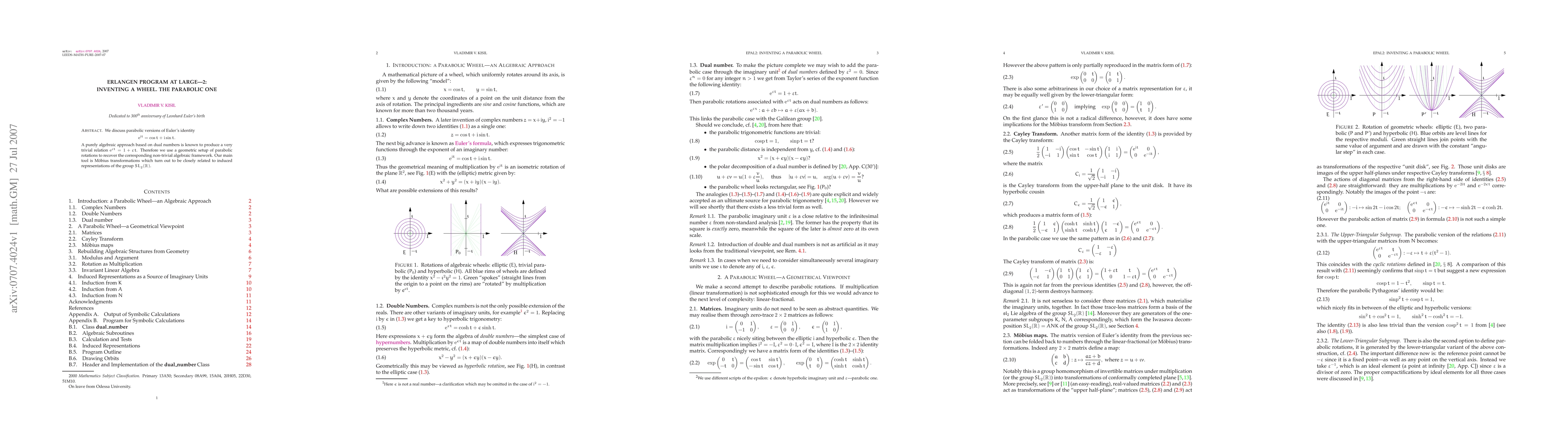 We discuss parabolic versions of Euler's identity e^{it}=cos t + i sin t. A purely algebraic approach based on dual numbers is known to produce a very trivial relation e^{pt} = 1+pt. Therefore we use a geometric setup of parabolic rotations to recover the corresponding non-trivial algebraic framework. Our main tool is Moebius transformations which turn out to be closely related to induced representations of the group SL(2,R). Keywords: complex numbers, dual numbers, double numbers, linear algebra, invariant, computer algebra, GiNaC