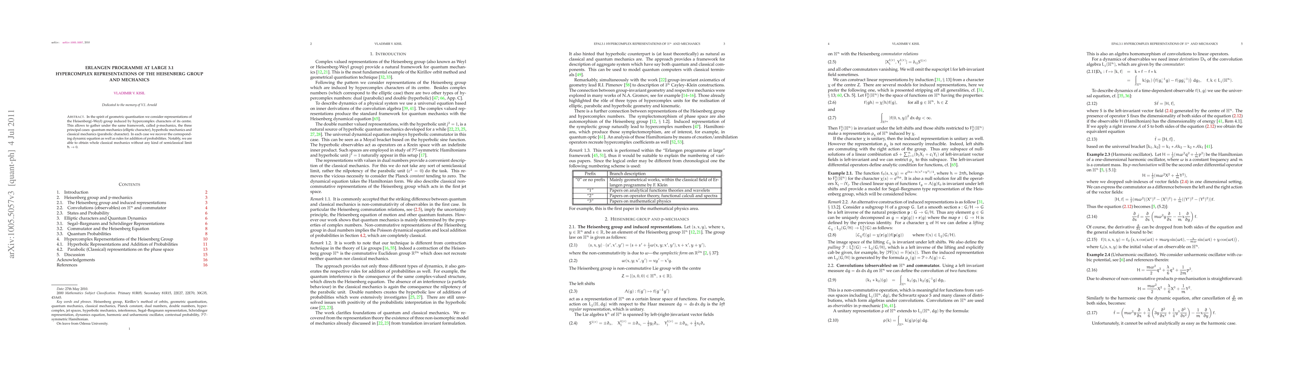 This paper explores representations of the Heisenberg group through hypercomplex characters, unifying quantum, hyperbolic, and classical mechanics under the framework of p-mechanics. It achieves classical mechanics without resorting to a semiclassical limit, highlighting the dynamic equations and probability addition rules.