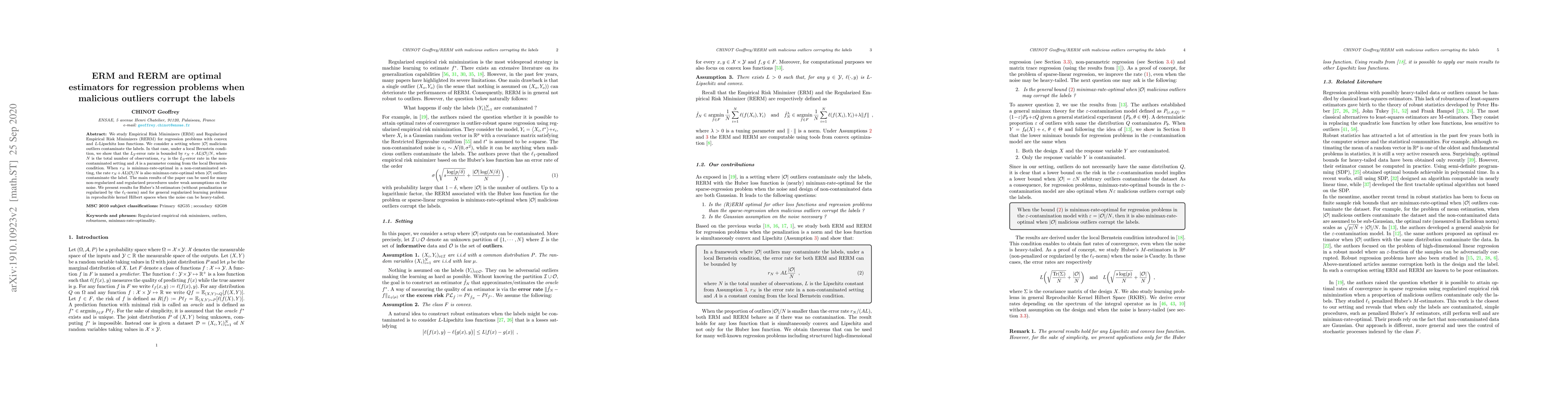 Empirical Risk Minimizers (ERM) and Regularized Empirical Risk Minimizers (RERM) are optimal estimators for regression problems even when malicious outliers corrupt the labels, with a bounded error rate that depends on the number of observations and outliers.