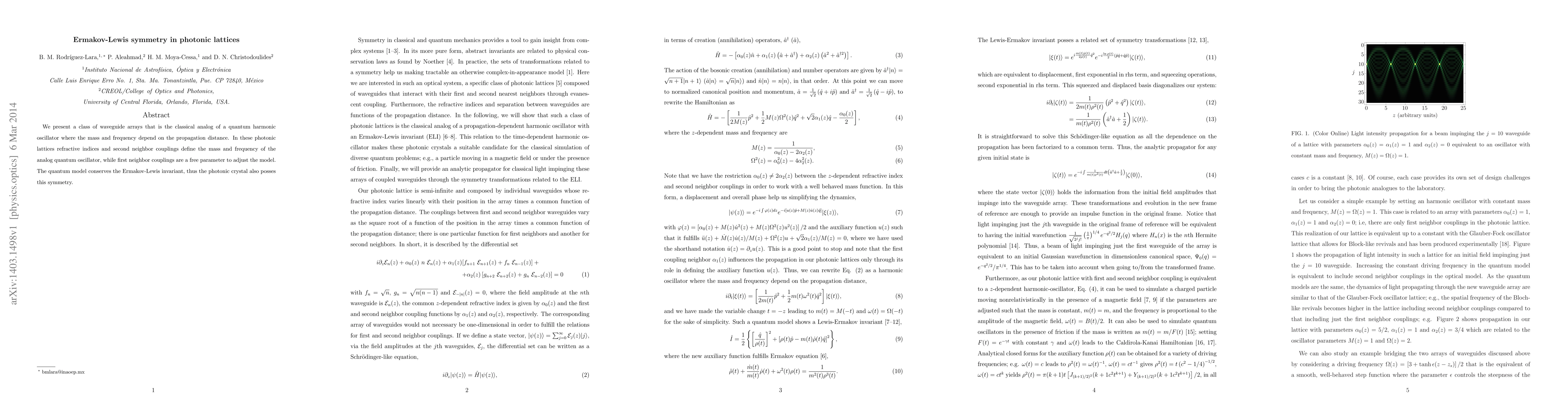 We present a class of waveguide arrays that is the classical analog of a quantum harmonic oscillator where the mass and frequency depend on the propagation distance. In these photonic lattices refractive indices and second neighbor couplings define the mass and frequency of the analog quantum oscillator, while first neighbor couplings are a free parameter to adjust the model. The quantum model conserves the Ermakov-Lewis invariant, thus the photonic crystal also posses this symmetry.