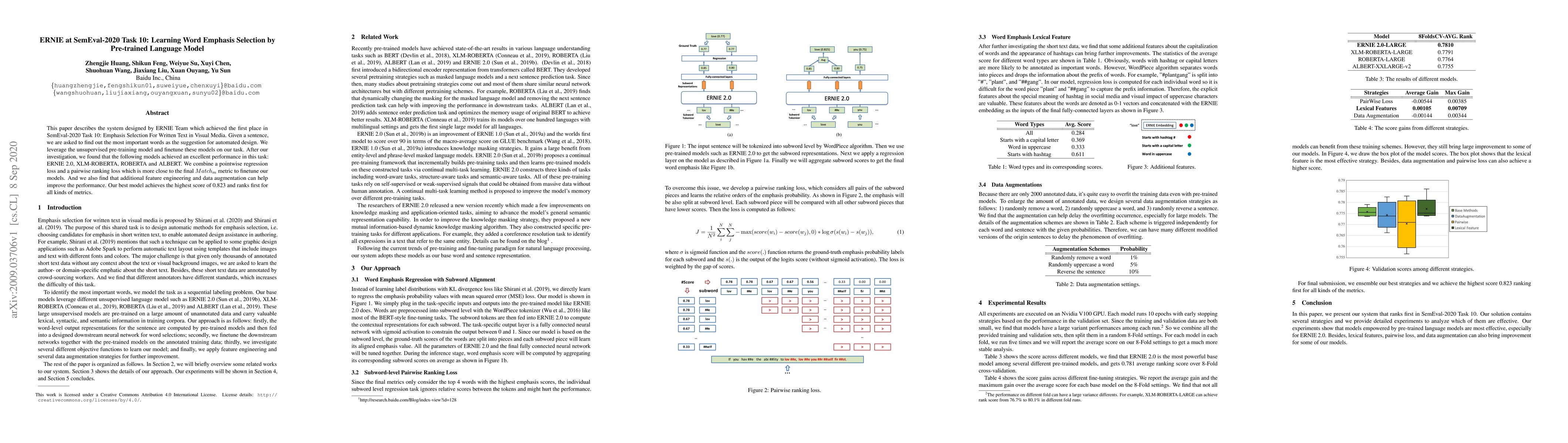 This paper describes the system designed by ERNIE Team which achieved the first place in SemEval-2020 Task 10: Emphasis Selection For Written Text in Visual Media. Given a sentence, we are asked to find out the most important words as the suggestion for automated design. We leverage the unsupervised pre-training model and finetune these models on our task. After our investigation, we found that the following models achieved an excellent performance in this task: ERNIE 2.0, XLM-ROBERTA, ROBERTA and ALBERT. We combine a pointwise regression loss and a pairwise ranking loss which is more close to the final M atchm metric to finetune our models. And we also find that additional feature engineering and data augmentation can help improve the performance. Our best model achieves the highest score of 0.823 and ranks first for all kinds of metrics