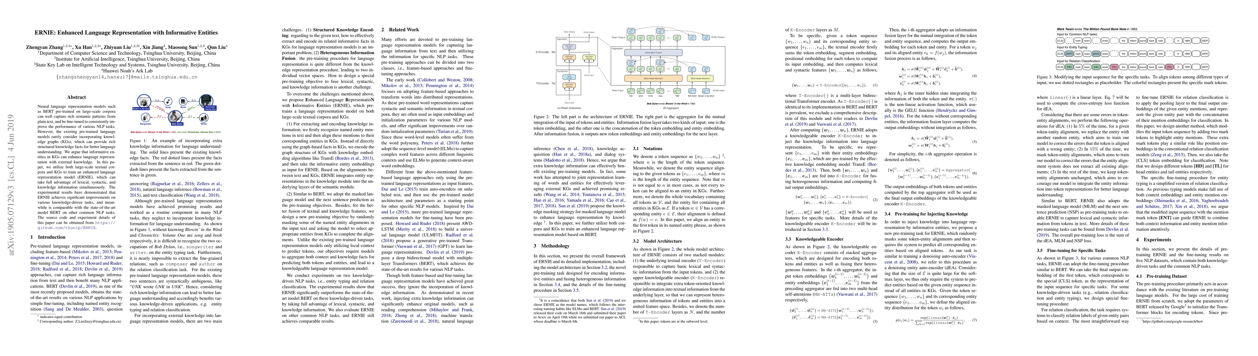 ERNIE enhances language representation by integrating knowledge graphs (KGs) with large-scale textual corpora, achieving significant improvements on knowledge-driven tasks while remaining competitive with BERT on general NLP tasks. The model leverages lexical, syntactic, and knowledge information for better language understanding.