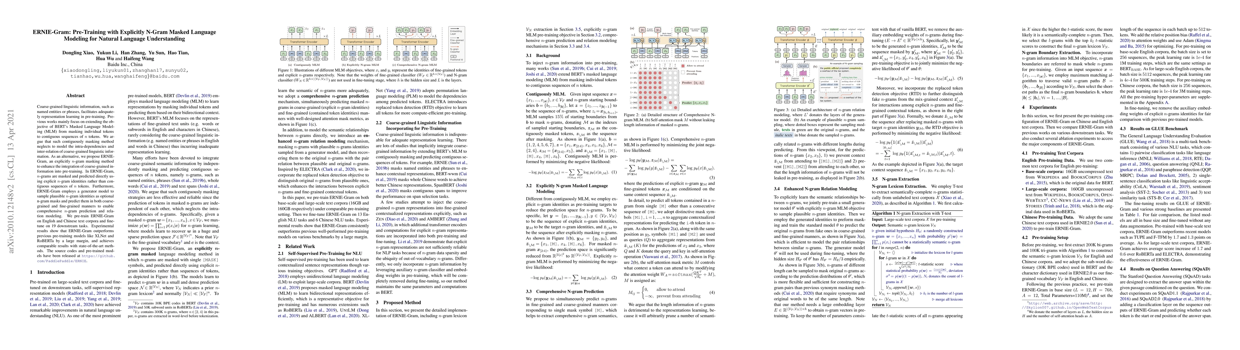 ERNIE-Gram introduces an explicitly n-gram masking method to better integrate coarse-grained linguistic information during pre-training, outperforming previous models like XLNet and RoBERTa on various downstream tasks. The approach uses explicit n-gram identities and a generator model to sample plausible n-gram masks for comprehensive prediction and relation modeling.