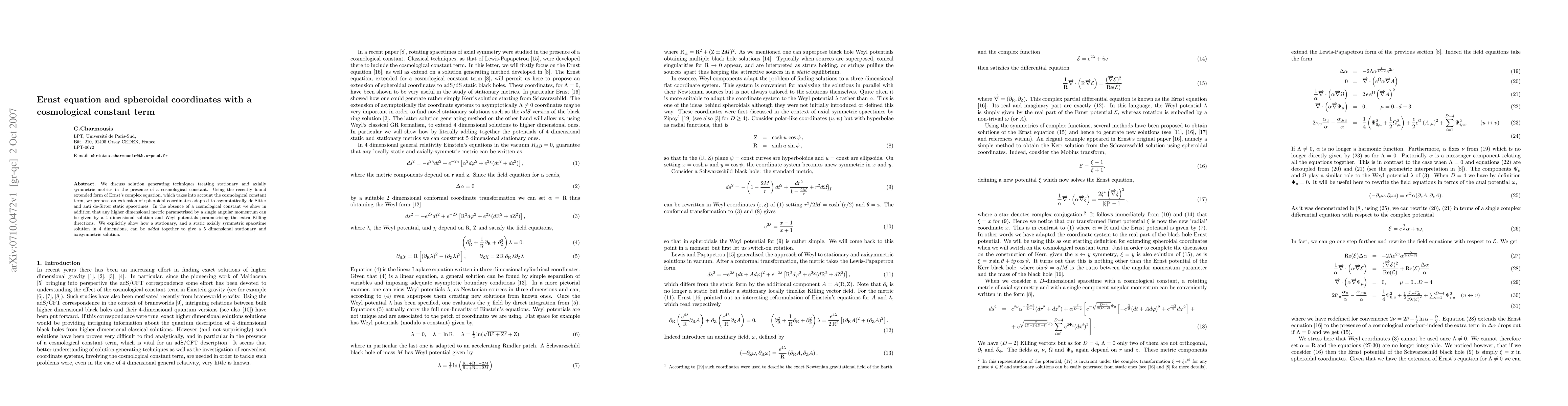 We discuss solution generating techniques treating stationary and axially symmetric metrics in the presence of a cosmological constant. Using the recently found extended form of Ernst's complex equation, which takes into account the cosmological constant term, we propose an extension of spheroidal coordinates adapted to asymptotically de-Sitter and anti de-Sitter static spacetimes. In the absence of a cosmological constant we show in addition that any higher dimensional metric parametrised by a single angular momentum can be given by a 4 dimensional solution and Weyl potentials parametrising the extra Killing directions. We explicitly show how a stationary, and a static axially symmetric spacetime solution in 4 dimensions, can be {\it added} together to give a 5 dimensional stationary and axisymmetric solution.