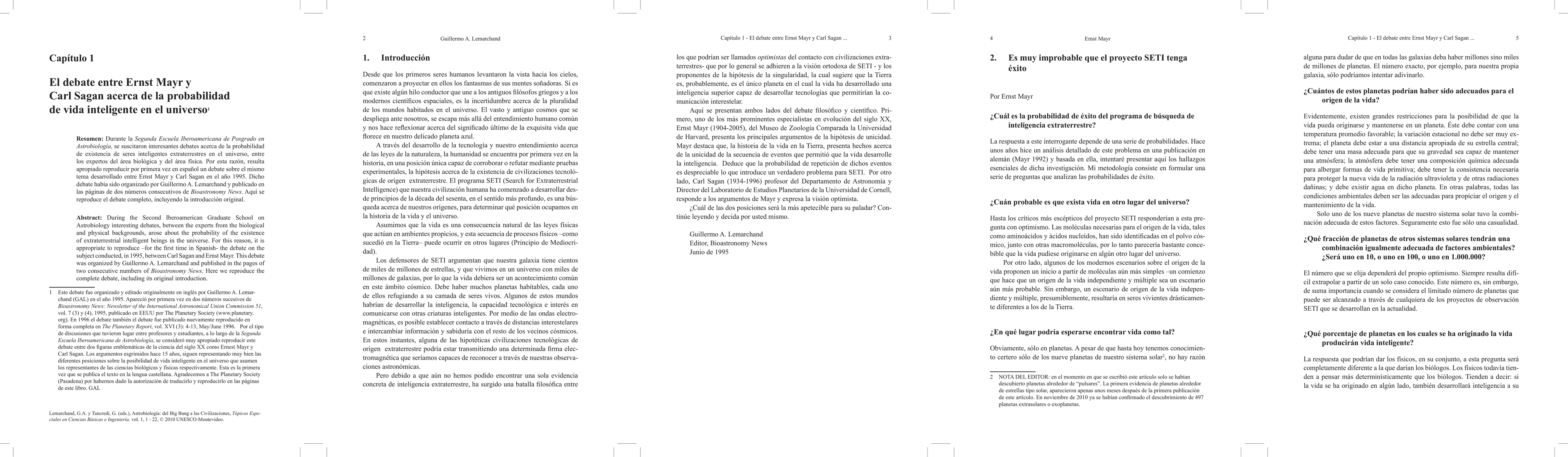 During the Second Iberoamerican Graduate School on Astrobiology interesting debates, between the experts from the biological and physical backgrounds, arose about the probability of the existence of extraterrestrial intelligent beings in the universe. For this reason, it is appropriate to reproduce -for the first time in Spanish- the debate on the subject conducted, in 1995, between Carl Sagan and Ernst Mayr. This debate was organized by Guillermo A. Lemarchand and published in the pages of two consecutive numbers of "Bioastronomy News". Here we reproduce the complete debate, including its original introduction.