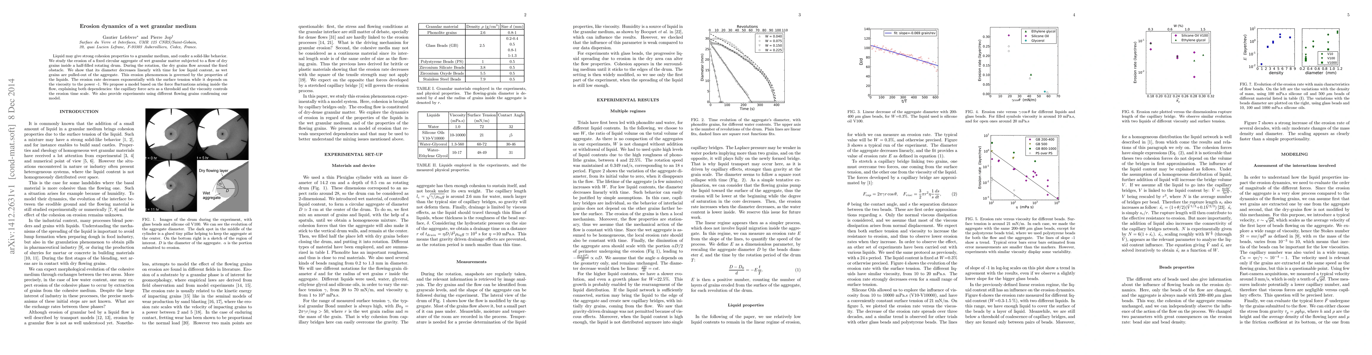 This study investigates the erosion dynamics of wet granular aggregates under the influence of flowing dry grains in a rotating drum. The research reveals that the erosion rate decreases linearly with time for low liquid content, governed by the liquid's surface tension and viscosity, with a model based on force fluctuations explaining these dependencies.