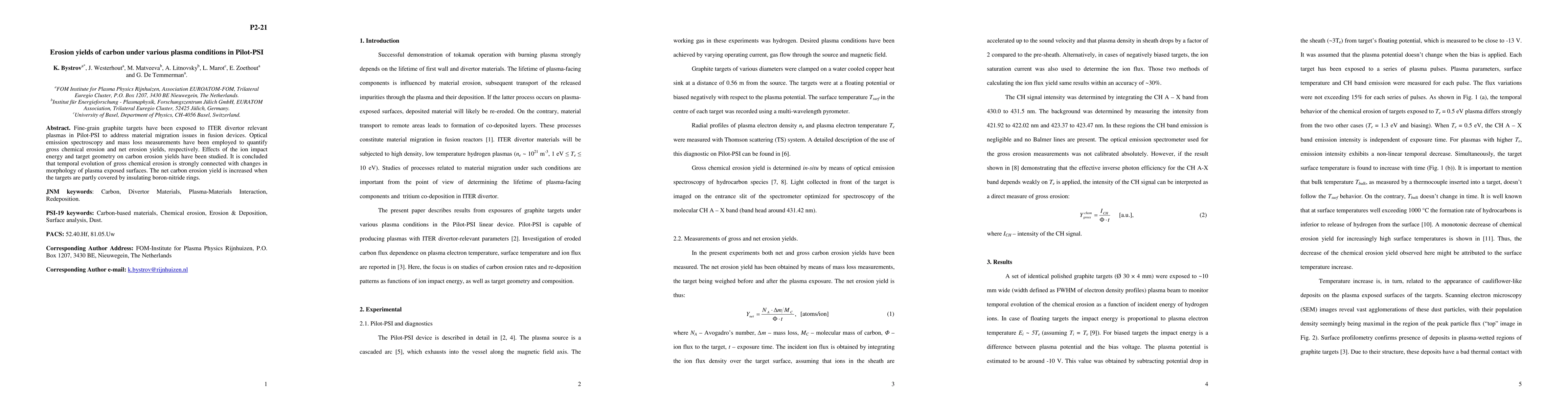 This study investigates carbon erosion yields in graphite targets exposed to plasma conditions relevant to ITER divertors in Pilot-PSI, using optical emission spectroscopy and mass loss measurements. The research finds that gross chemical erosion correlates with plasma-exposed surface morphology changes, and net erosion yields increase when targets are partially covered by boron-nitride rings.