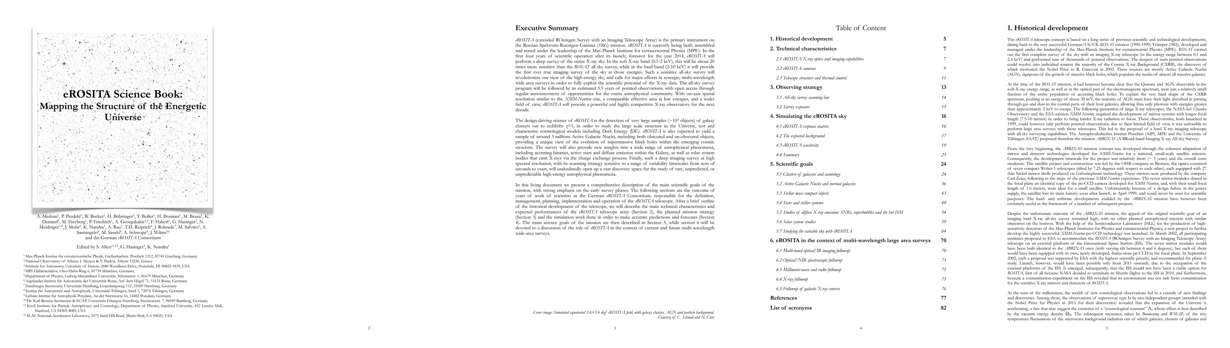 eROSITA is the primary instrument on the Russian SRG mission. In the first four years of scientific operation after its launch, foreseen for 2014, it will perform a deep survey of the entire X-ray sky. In the soft X-ray band (0.5-2 keV), this will be about 20 times more sensitive than the ROSAT all sky survey, while in the hard band (2-10 keV) it will provide the first ever true imaging survey of the sky at those energies. Such a sensitive all-sky survey will revolutionize our view of the high-energy sky, and calls for major efforts in synergic, multi-wavelength wide area surveys in order to fully exploit the scientific potential of the X-ray data. The design-driving science of eROSITA is the detection of very large samples (~10^5 objects) of galaxy clusters out to redshifts z>1, in order to study the large scale structure in the Universe, test and characterize cosmological models including Dark Energy. eROSITA is also expected to yield a sample of around 3 millions Active Galactic Nuclei, including both obscured and un-obscured objects, providing a unique view of the evolution of supermassive black holes within the emerging cosmic structure. The survey will also provide new insights into a wide range of astrophysical phenomena, including accreting binaries, active stars and diffuse emission within the Galaxy, as well as solar system bodies that emit X-rays via the charge exchange process. Finally, such a deep imaging survey at high spectral resolution, with its scanning strategy sensitive to a range of variability timescales from tens of seconds to years, will undoubtedly open up a vast discovery space for the study of rare, unpredicted, or unpredictable high-energy astrophysical phenomena. In this living document we present a comprehensive description of the main scientific goals of the mission, with strong emphasis on the early survey phases.