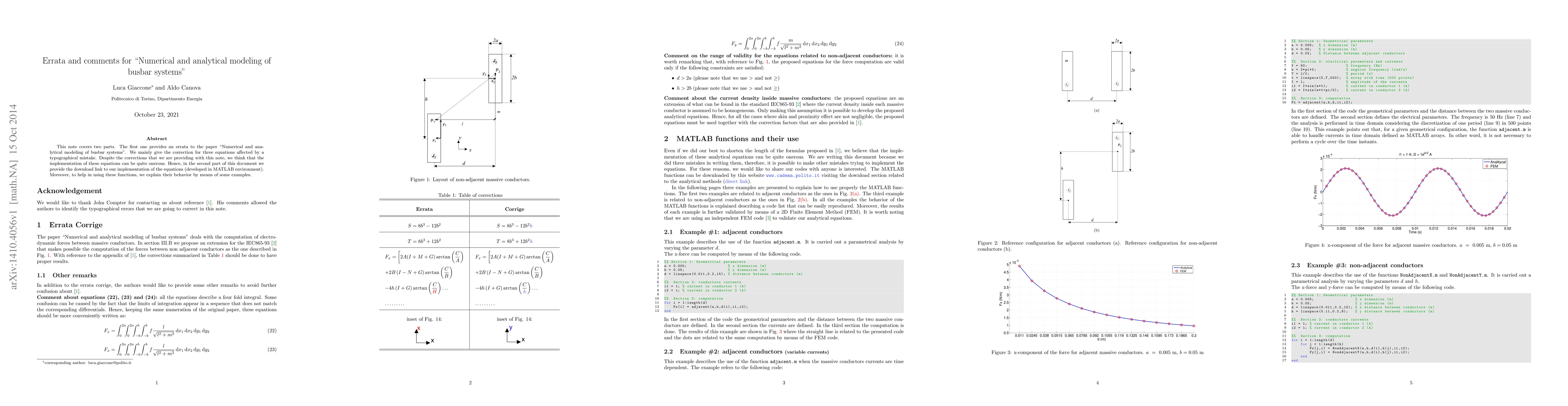 This note covers two parts. The first one provides an errata to the paper "Numerical and analytical modeling of busbar systems". We mainly give the correction for three equations affected by a typographical mistake. Despite the corrections that we are providing with this note, we think that the implementation of these equations can be quite onerous. Hence, in the second part of this document we provide the download link to our implementation of the equations (developed in MATLAB environment). Moreover, to help in using these functions, we explain their behavior by means of some examples.