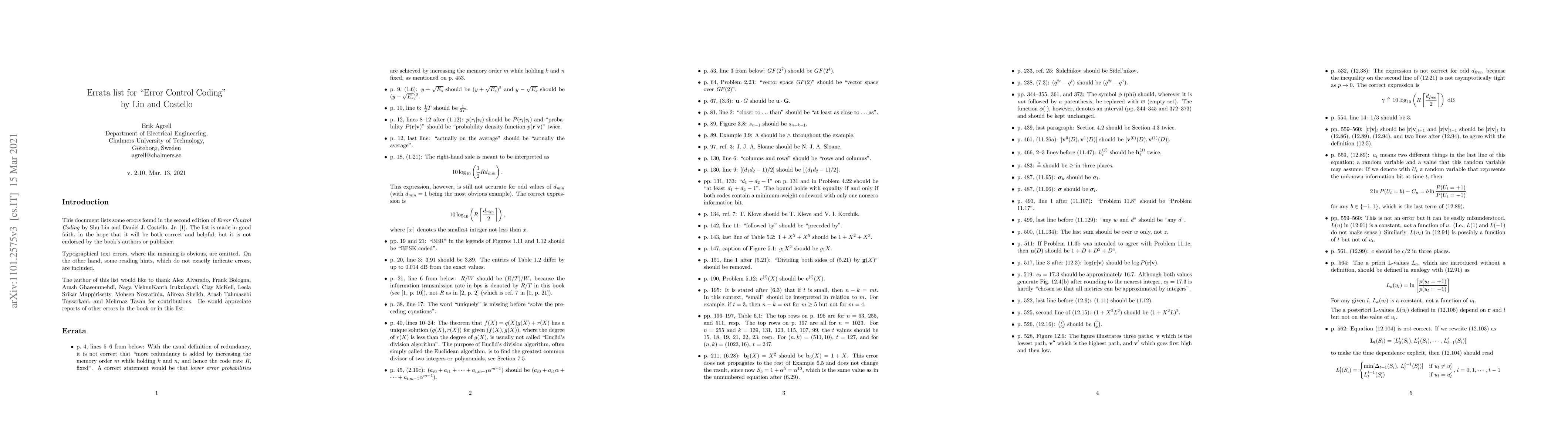 The errata list aims to improve the accuracy of the original publication, ensuring it provides reliable information on error control coding techniques.