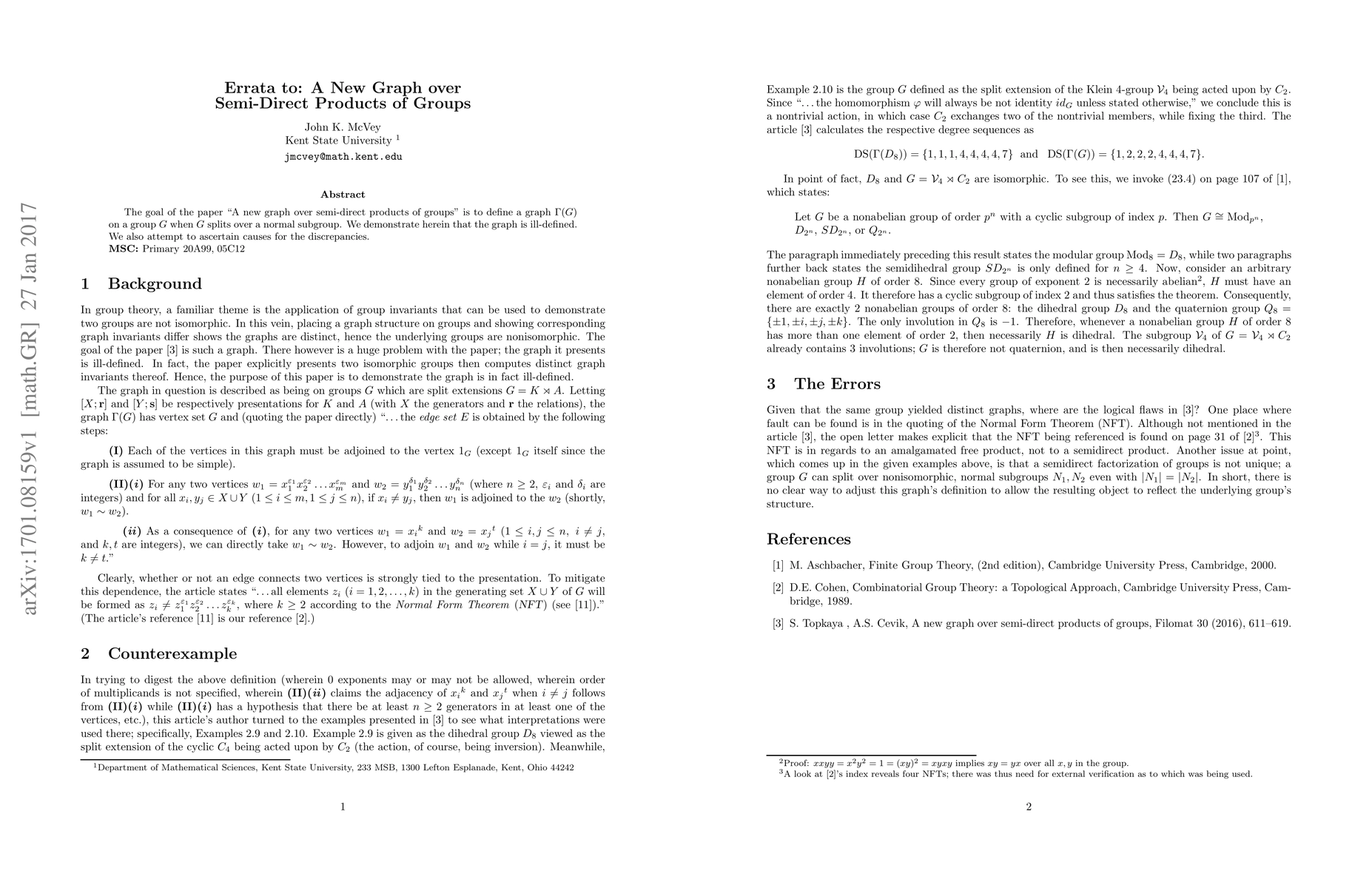 The goal of the paper "A new graph over semi-direct products of groups" is to define a graph \Gamma(G) on a group G when G splits over a normal subgroup. We demonstrate herein that the graph is ill-defined. We also attempt to ascertain causes for the discrepancies.