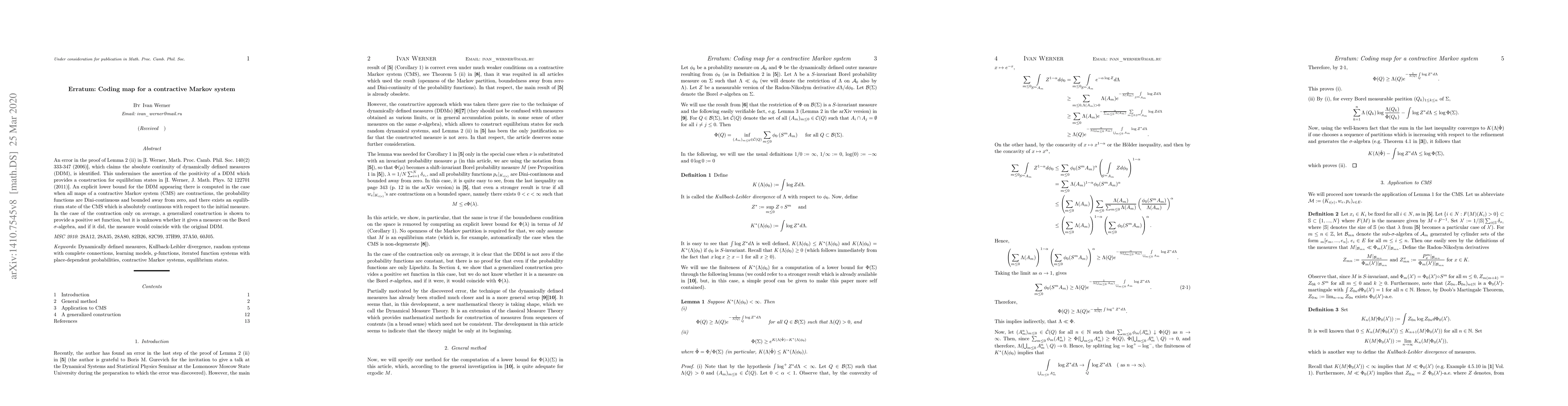 An error in the proof of Lemma 2 (ii) in [I. Werner, Math. Proc. Camb. Phil. Soc. 140(2) 333-347 (2006)], which claims the absolute continuity of dynamically defined measures (DDM), is identified. This undermines the assertion of the positivity of a DDM which provides a construction for equilibrium states in [I. Werner, J. Math. Phys. 52 122701 (2011)]. An explicit lower bound for the DDM appearing there is computed in the case when all maps of a contractive Markov system (CMS) are contractions, the probability functions are Dini-continuous and bounded away from zero, and there exists an equilibrium state of the CMS which is absolutely continuous with respect to the initial measure. In the case of the contraction only on average, a generalized construction is shown to provide a positive set function, but it is unknown whether it gives a measure on the Borel $\sigma$-algebra, and if it did, the measure would coincide with the original DDM.