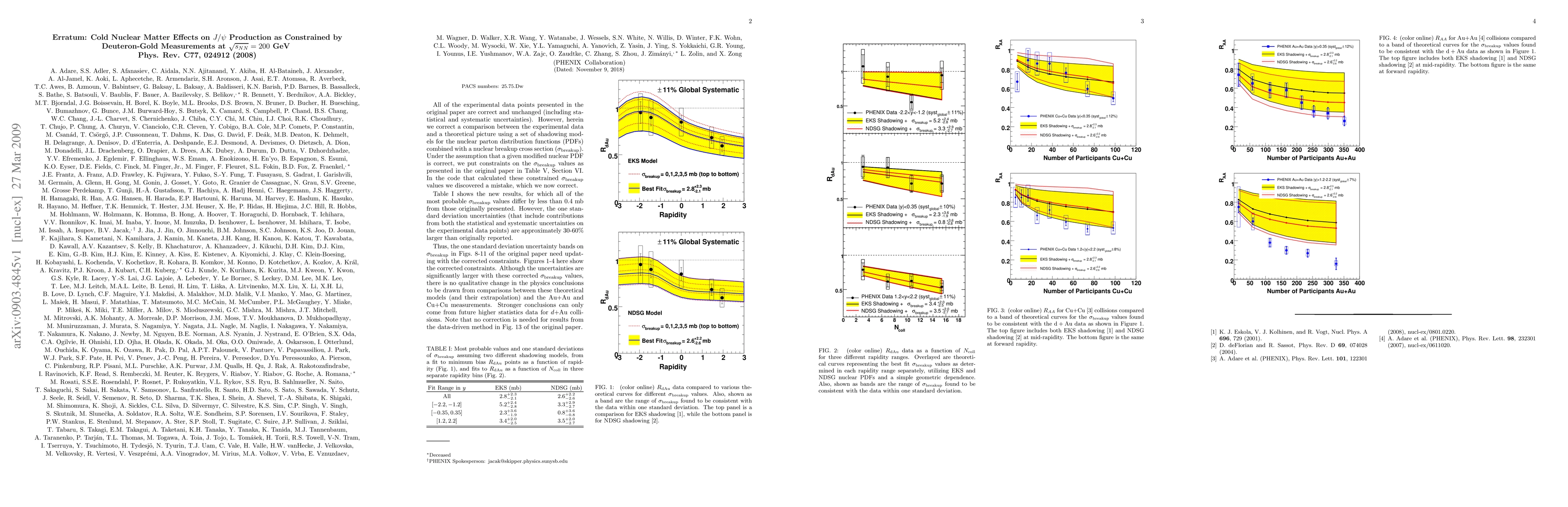 All of the experimental data points presented in the original paper are correct and unchanged (including statistical and systematic uncertainties). However, herein we correct a comparison between the experimental data and a theoretical picture, because we discovered a mistake in the code used. All of the most probable sigma_breakup values differ by less than 0.4 mb from those originally presented. However, the one standard deviation uncertainties (that include contributions from both the statistical and systematic uncertainties on the experimental data points) are approximately 30-60% larger than originally reported. We give a table of the new comparison results and corrected versions of Figs. 8-11 of the original paper and we note that no correction is needed for results from the data-driven method in Fig. 13.