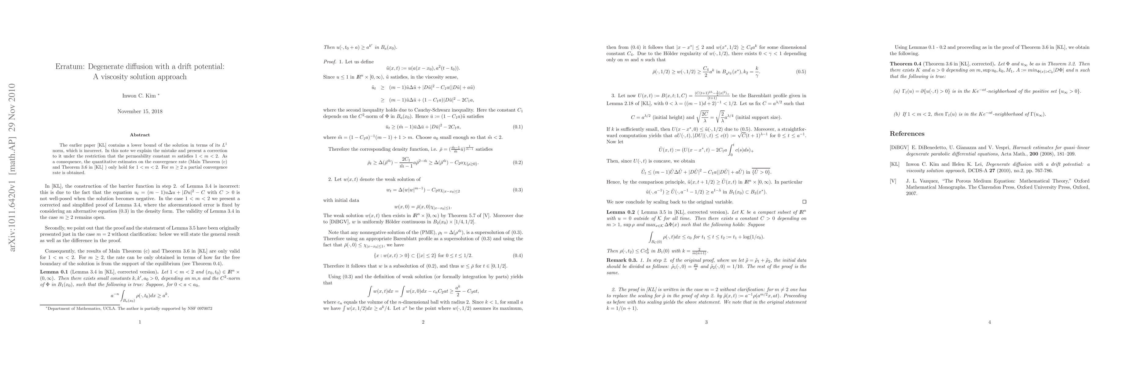 The paper corrects a mistake in an earlier study on degenerate diffusion with drift potential, providing a corrected lower bound solution for the L1 norm of the solution when the permeability constant m satisfies 1 < m < 2.
