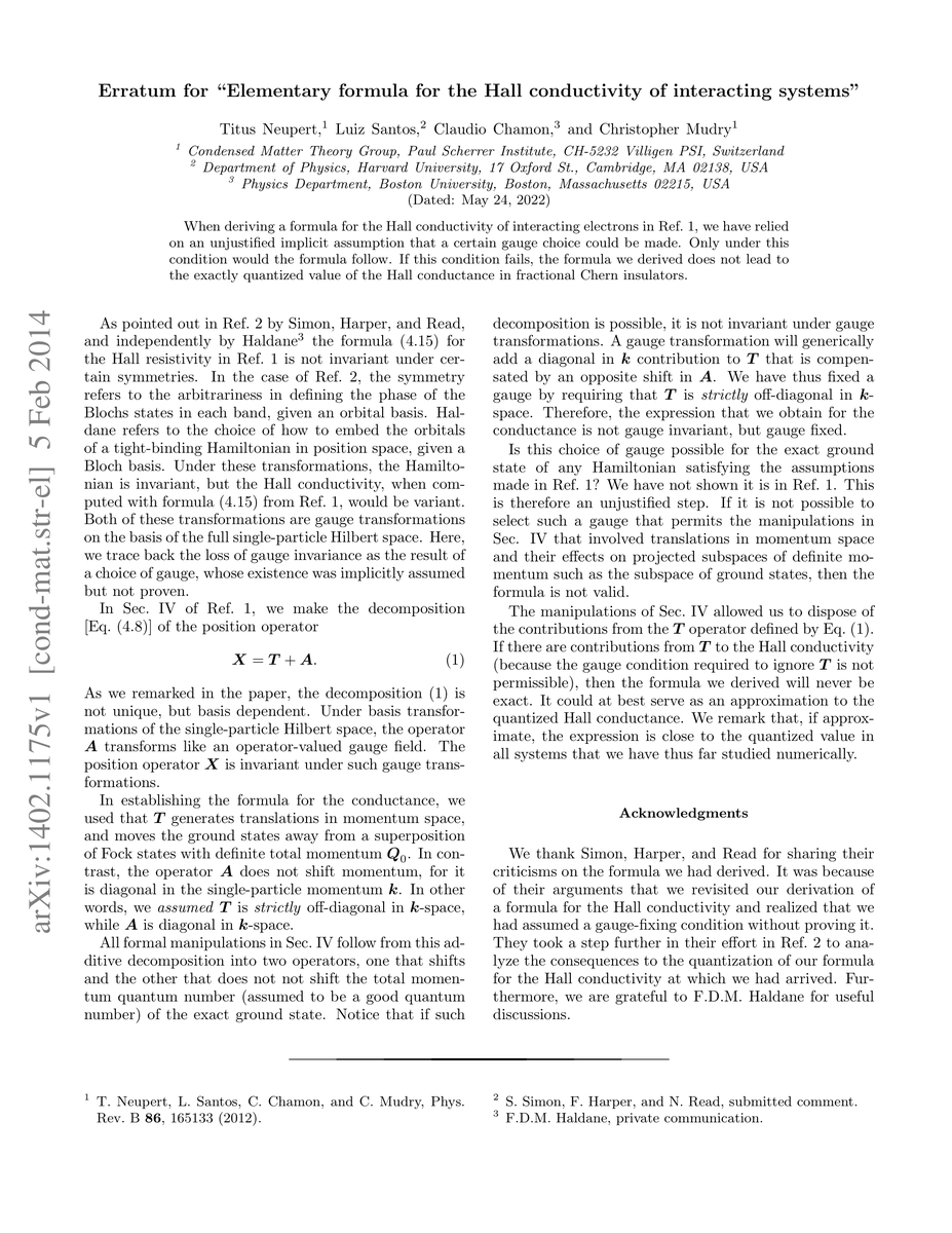 When deriving a formula for the Hall conductivity of interacting electrons in Phys. Rev. B 86, 165133, we have relied on an unjustified implicit assumption that a certain gauge choice could be made. Only under this condition would the formula follow. If this condition fails, the formula we derived does not lead to the exactly quantized value of the Hall conductance in fractional Chern insulators.