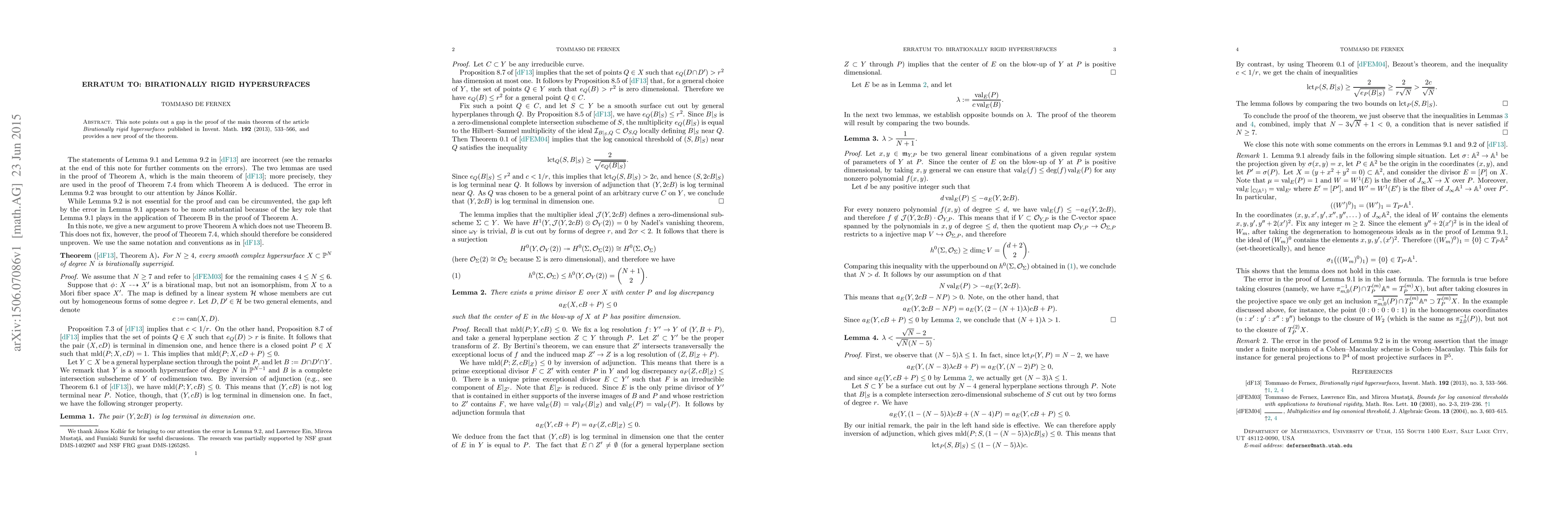 This note points out a gap in the proof of the main theorem of the article "Birationally rigid hypersurfaces" published in Invent. Math. 192 (2013), 533-566, and provides a new proof of the theorem.