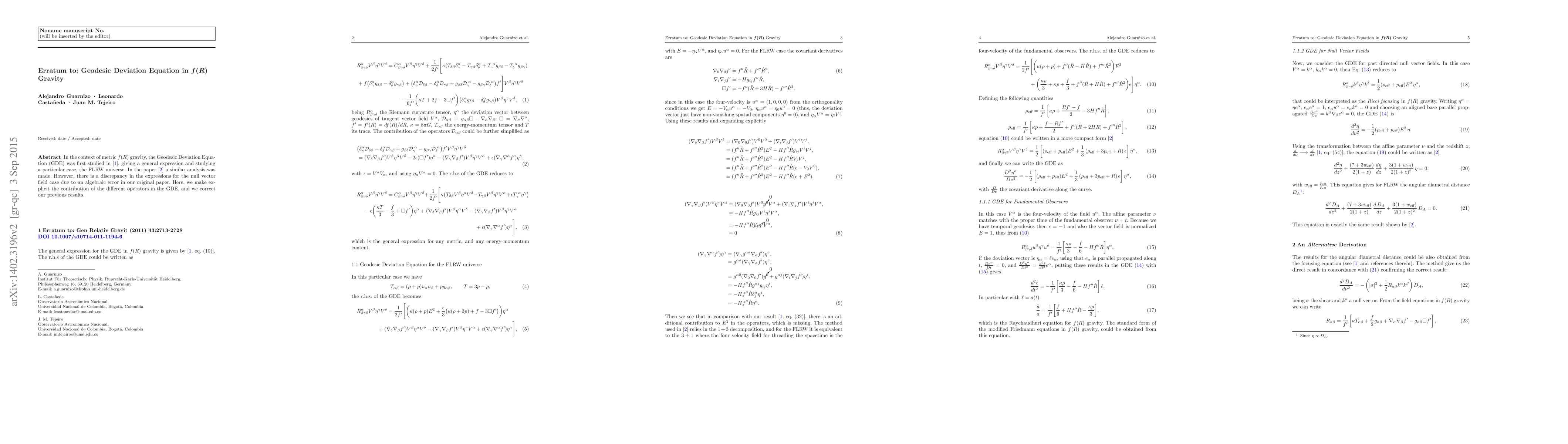 In the context of metric $f(R)$ gravity, the Geodesic Deviation Equation (GDE) was first studied in arXiv:1010.5279v3, giving a general expression and studying a particular case, the FLRW universe. In the paper arXiv:1312.2022v1 a similar analysis was made. However, there is a discrepancy in the expressions for the null vector field case due to an algebraic error in our original paper. Here, we make explicit the contribution of the different operators in the GDE, and we correct our previous results.
