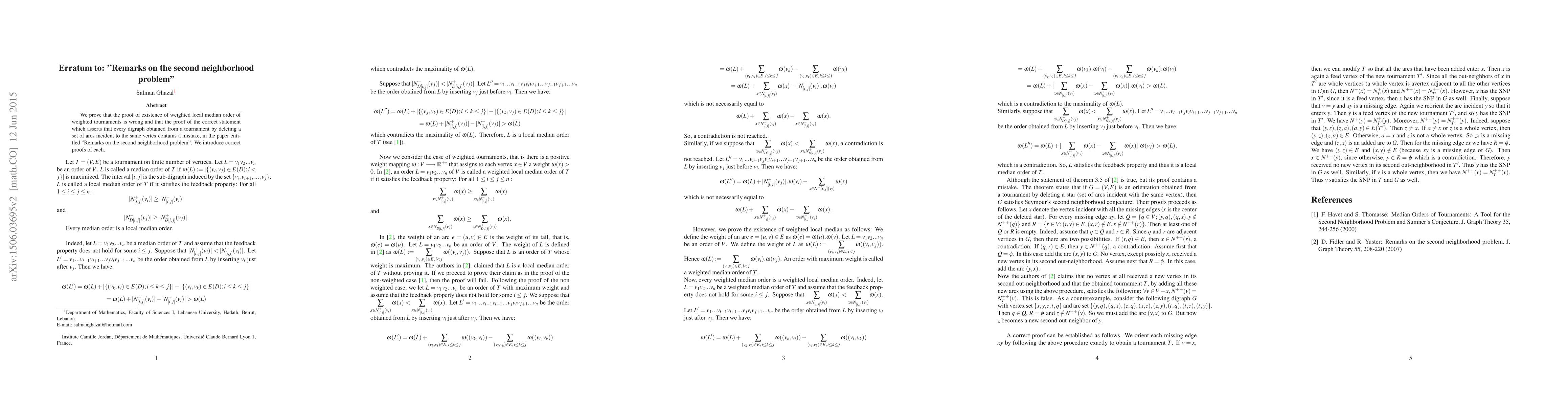 We prove that the proof of existence of weighted local median order of weighted tournaments is wrong and that the proof of the correct statement which asserts that every digraph obtained from a tournament by deleting a set of arcs incident to the same vertex contains a mistake, in the paper entitled "Remarks on the second neighborhood problem". We introduce correct proofs of each.