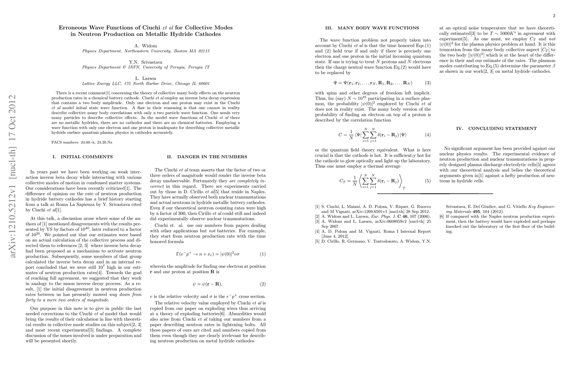 There is a recent comment (Ciuchi et al., 2012) concerning the theory of collective many body effects on the neutron production rates in a chemical battery cathode. Ciuchi et al employ an inverse beta decay expression that contains a two body amplitude. Only one electron and one proton may exist in the Ciuchi et al model initial state wave function. A flaw in their reasoning is that one cannot in reality describe collective many body correlations with only a two particle wave function. One needs very many particles to describe collective effects. In the model wave functions of Ciuchi et al there are no metallic hydrides, there are no cathodes and there are no chemical batteries. Employing a wave function with only one electron and one proton is inadequate for describing collective metallic hydride surface quantum plasma physics in cathodes accurately.