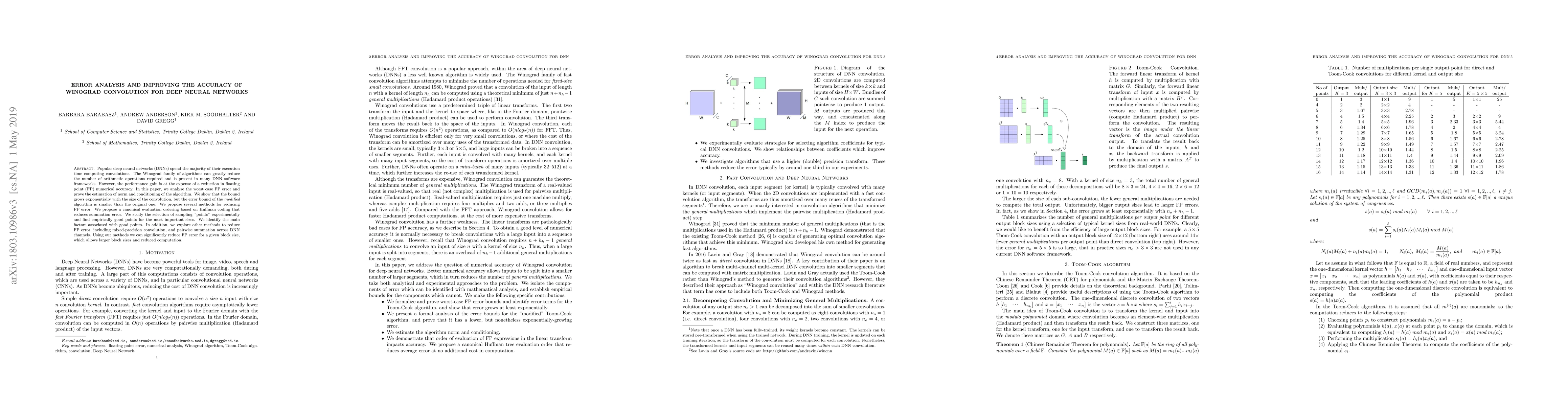 The paper presents an error analysis of the Winograd convolution algorithm used in deep neural networks (DNNs), proving bounds for floating-point (FP) numerical accuracy. It proposes methods to reduce FP errors, including a canonical evaluation ordering based on Huffman coding, selection of sampling points, mixed-precision convolution, and pairwise summation across DNN channels.