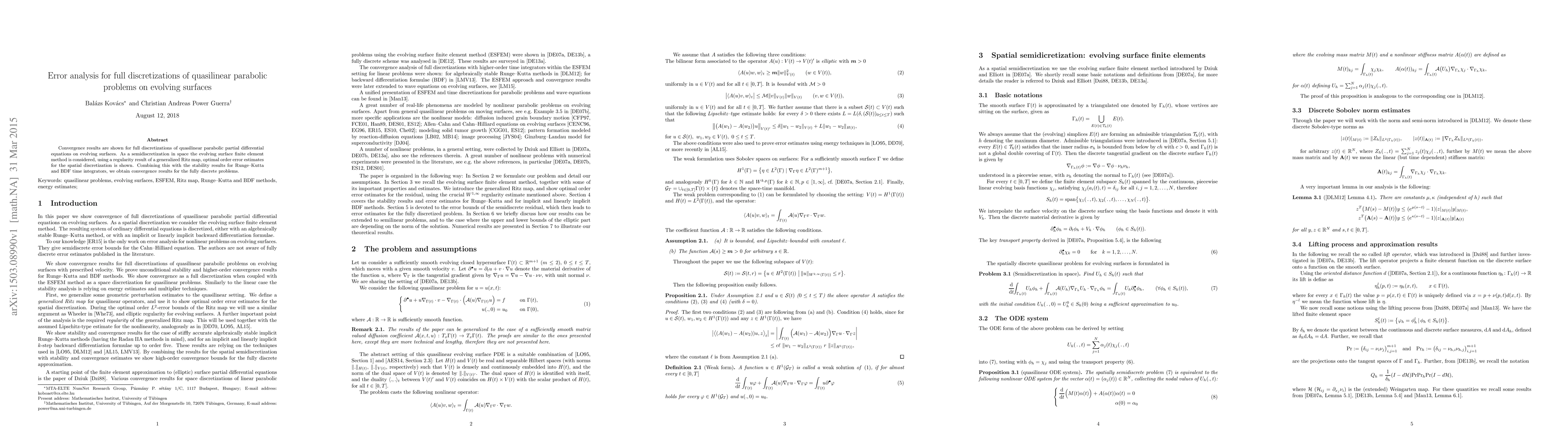 Convergence results are shown for full discretizations of quasilinear parabolic partial differential equations on evolving surfaces. As a semidiscretization in space the evolving surface finite element method is considered, using a regularity result of a generalized Ritz map, optimal order error estimates for the spatial discretization is shown. Combining this with the stability results for Runge--Kutta and BDF time integrators, we obtain convergence results for the fully discrete problems.
