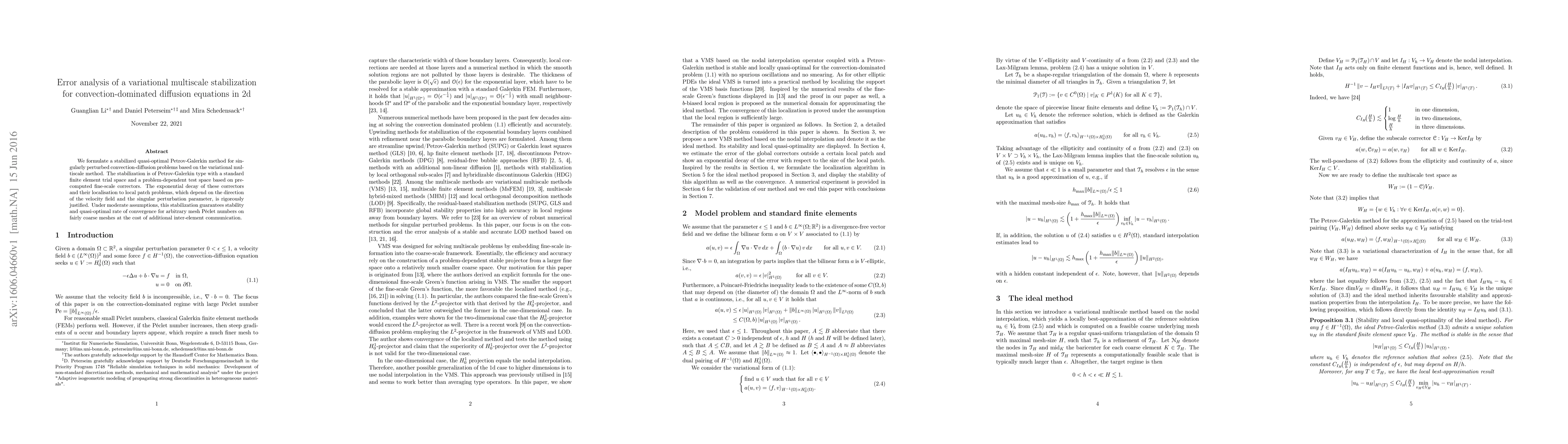 This paper proposes a stabilized quasi-optimal Petrov-Galerkin method for convection-dominated diffusion equations using variational multiscale stabilization. The method employs pre-computed fine-scale correctors to ensure stability and quasi-optimal convergence on coarse meshes.