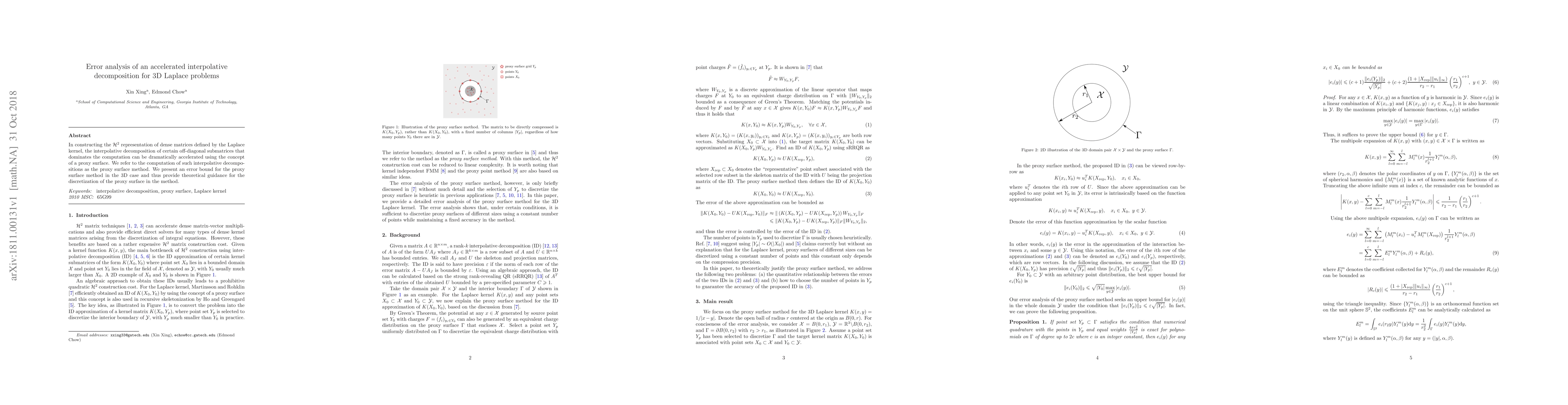 This paper presents an error analysis for the accelerated interpolative decomposition method, known as the proxy surface method, used to efficiently compute $\mathcal{H}^2$ representations of dense matrices defined by the Laplace kernel in 3D. It provides a theoretical error bound for this method, offering guidance for discretizing the proxy surface.