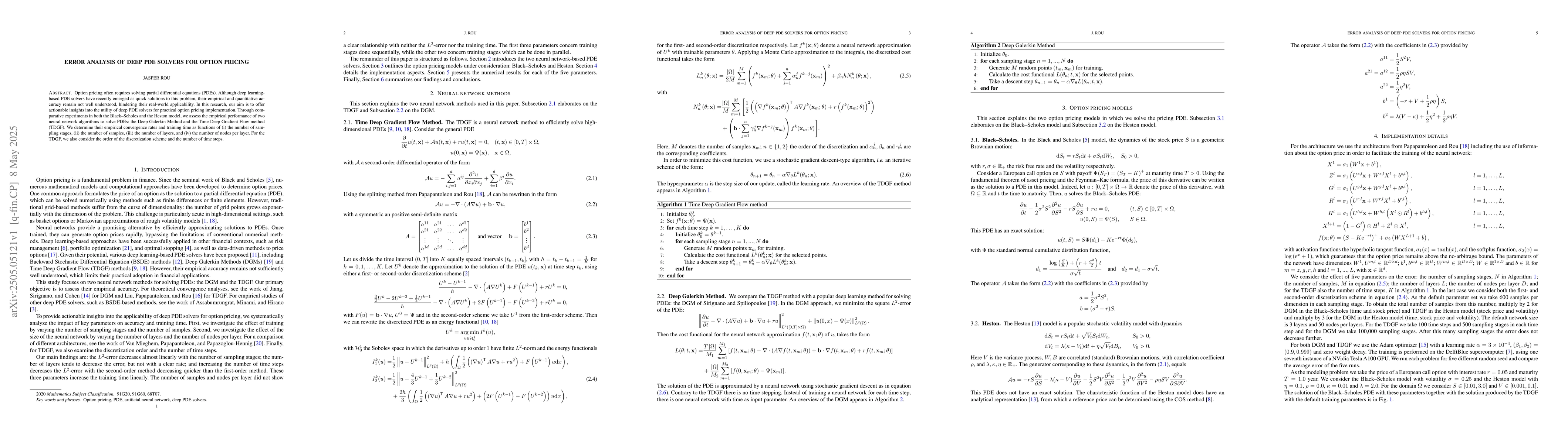 Provided a detailed error analysis of deep PDE solvers, specifically the Deep Galerkin Method and TDGF, for option pricing, including their convergence rates and training time dependencies.