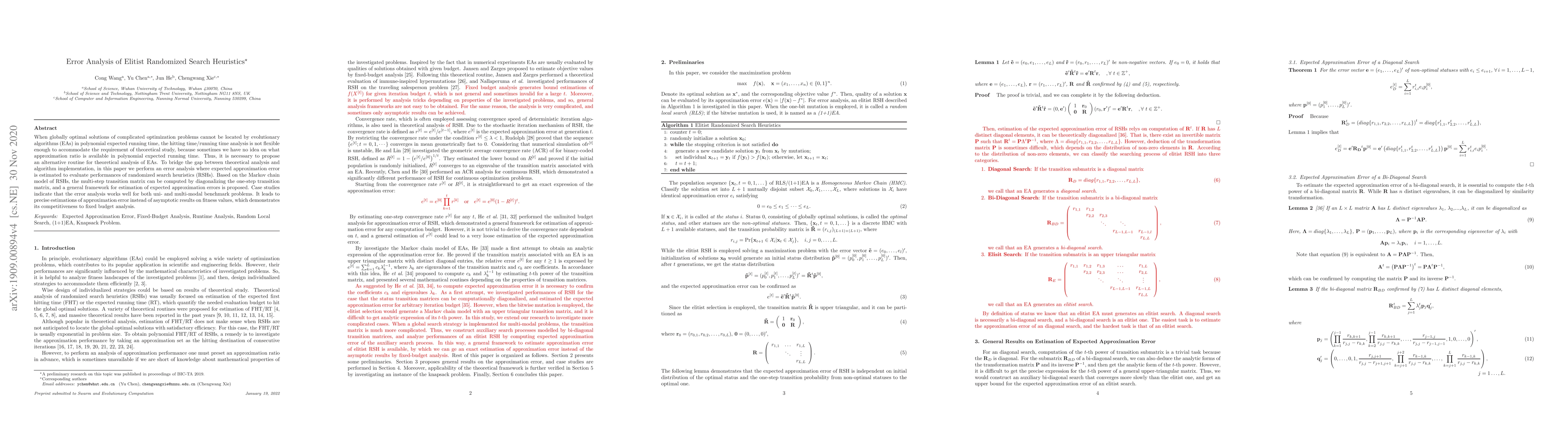 When globally optimal solutions of complicated optimization problems cannot be located by evolutionary algorithms (EAs) in polynomial expected running time, the hitting time/running time analysis is not flexible enough to accommodate the requirement of theoretical study, because sometimes we have no idea on what approximation ratio is available in polynomial expected running time. Thus, it is necessary to propose an alternative routine for the theoretical analysis of EAs. To bridge the gap between theoretical analysis and algorithm implementation, in this paper we perform an error analysis where expected approximation error is estimated to evaluate performances of randomized search heuristics (RSHs). Based on the Markov chain model of RSHs, the multi-step transition matrix can be computed by diagonalizing the one-step transition matrix, and a general framework for estimation of expected approximation errors is proposed. Case studies indicate that the error analysis works well for both uni- and multi-modal benchmark problems. It leads to precise estimations of approximation error instead of asymptotic results on fitness values, which demonstrates its competitiveness to fixed budget analysis.