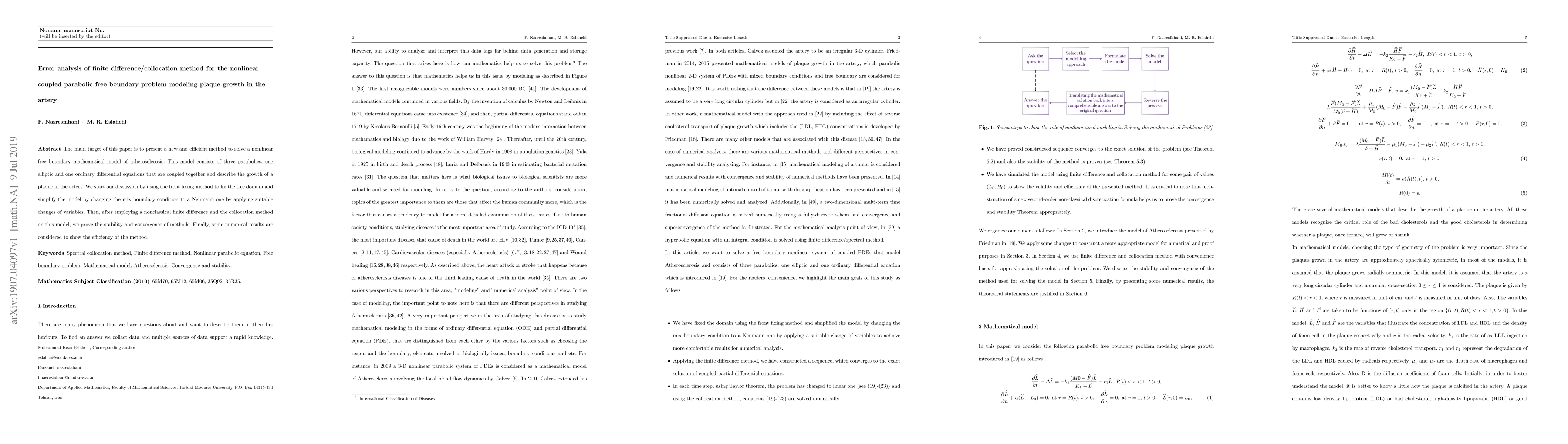 The main target of this paper is to present a new and efficient method to solve a nonlinear free boundary mathematical model of atherosclerosis. This model consists of three parabolics, one elliptic and one ordinary differential equations that are coupled together and describe the growth of a plaque in the artery. We start our discussion by using the front fixing method to fix the free domain and simplify the model by changing the mix boundary condition to a Neumann one by applying suitable changes of variables. Then, after employing a nonclassical finite difference and the collocation method on this model, we prove the stability and convergence of methods. Finally, some numerical results are considered to show the efficiency of the method.