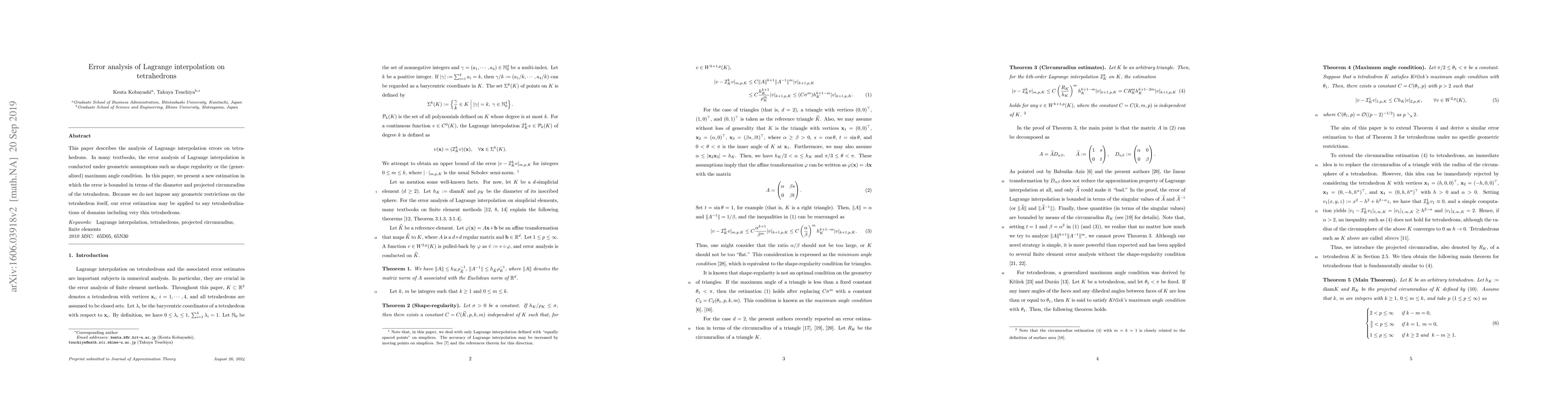 This paper describes the analysis of Lagrange interpolation errors on tetrahedrons. In many textbooks, the error analysis of Lagrange interpolation is conducted under geometric assumptions such as shape regularity or the (generalized) maximum angle condition. In this paper, we present a new estimation in which the error is bounded in terms of the diameter and projected circumradius of the tetrahedron. Because we do not impose any geometric restrictions on the tetrahedron itself, our error estimation may be applied to any tetrahedralizations of domains including very thin tetrahedrons.