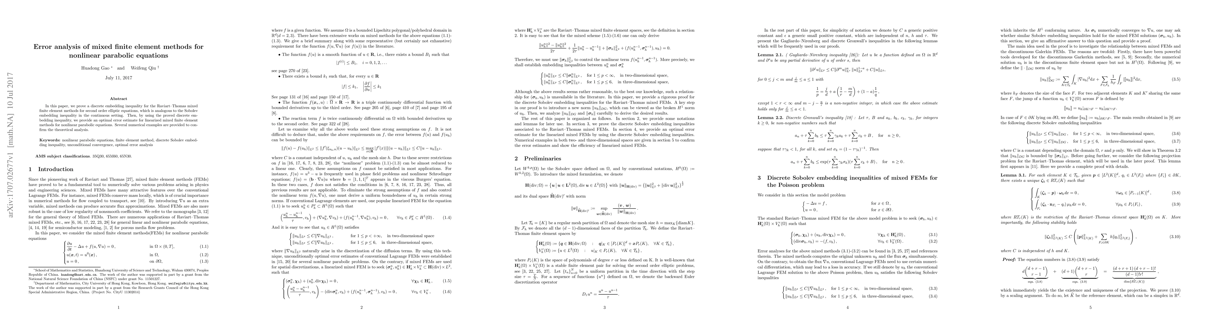 This paper establishes a discrete embedding inequality for Raviart-Thomas mixed finite element methods, analogous to the continuous Sobolev embedding inequality, and uses it to derive an optimal error estimate for linearized mixed finite element methods applied to nonlinear parabolic equations, with numerical examples validating the theoretical results.