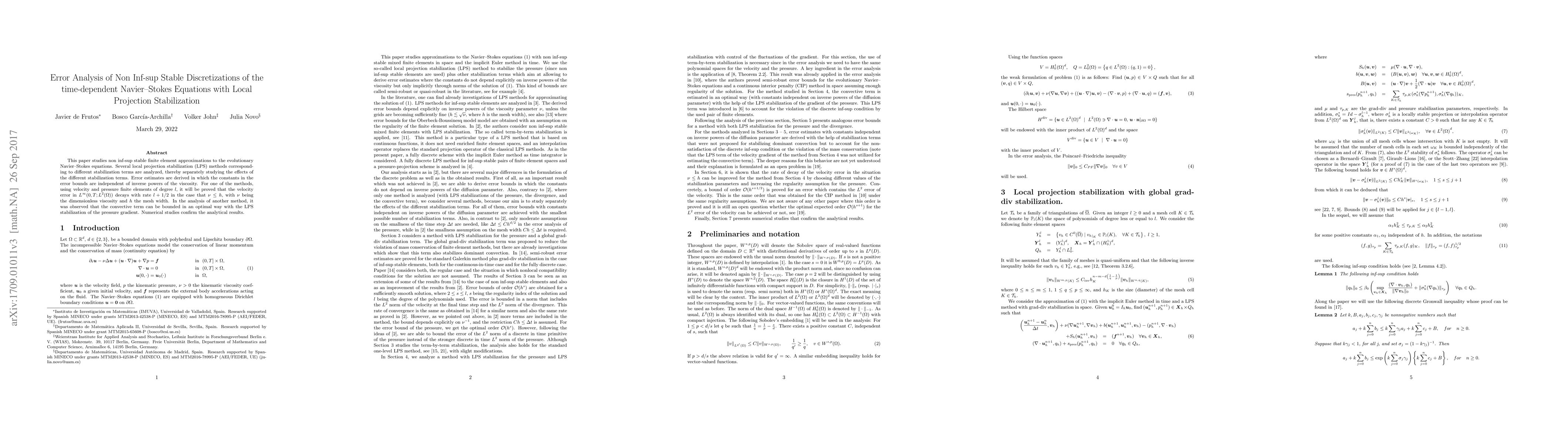This paper investigates non inf-sup stable finite element methods for the time-dependent Navier-Stokes equations using local projection stabilization, deriving error estimates independent of the viscosity. Numerical results confirm the analytical findings, particularly showing optimal velocity decay rates for certain methods.