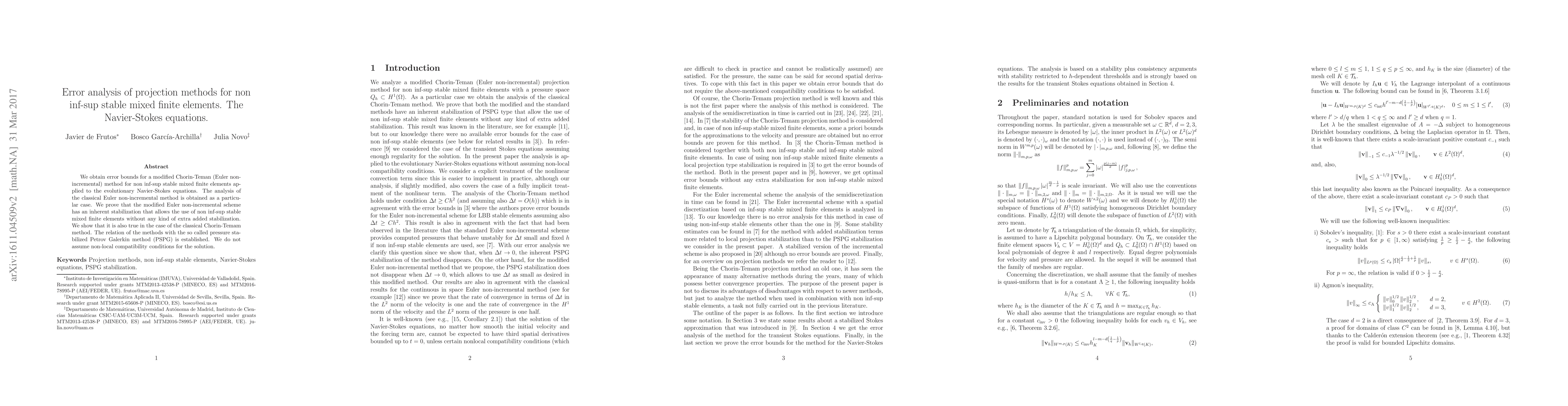 This paper provides error bounds for a modified Euler non-incremental method for solving the Navier-Stokes equations using non inf-sup stable mixed finite elements, demonstrating inherent stabilization without extra stabilization techniques. It also compares the method to the classical Chorin-Temam method and the pressure stabilized Petrov Galerkin method (PSPG).