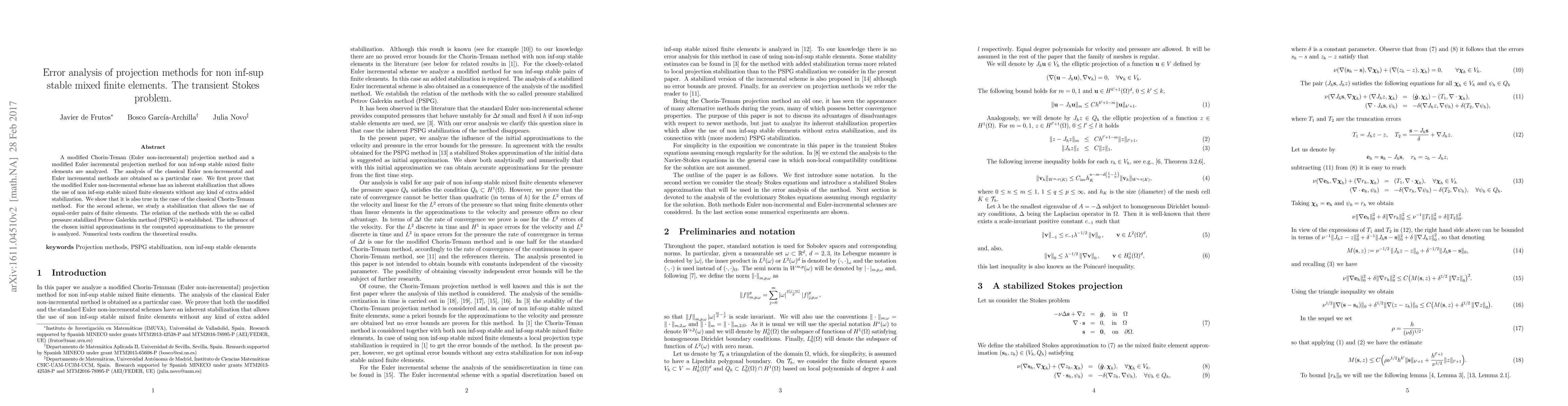This paper analyzes modified projection methods for transient Stokes problems using non inf-sup stable mixed finite elements. It proves inherent stabilization in the modified Euler non-incremental scheme and explores stabilization for the modified Euler incremental method, confirming theoretical results with numerical tests.