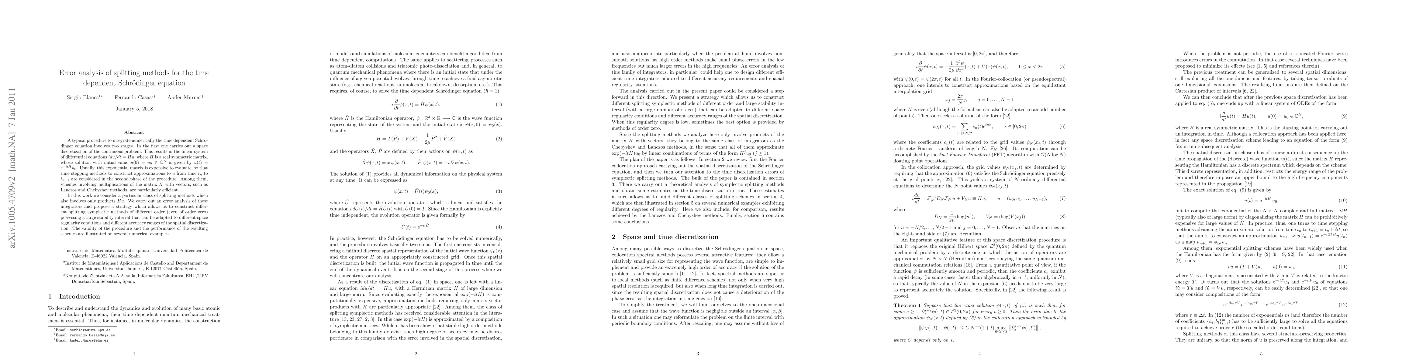 A typical procedure to integrate numerically the time dependent Schr\"o\-din\-ger equation involves two stages. In the first one carries out a space discretization of the continuous problem. This results in the linear system of differential equations $i du/dt = H u$, where $H$ is a real symmetric matrix, whose solution with initial value $u(0) = u_0 \in \mathbb{C}^N$ is given by $u(t) = \e^{-i t H} u_0$. Usually, this exponential matrix is expensive to evaluate, so that time stepping methods to construct approximations to $u$ from time $t_n$ to $t_{n+1}$ are considered in the second phase of the procedure. Among them, schemes involving multiplications of the matrix $H$ with vectors, such as Lanczos and Chebyshev methods, are particularly efficient. In this work we consider a particular class of splitting methods which also involves only products $Hu$. We carry out an error analysis of these integrators and propose a strategy which allows us to construct different splitting symplectic methods of different order (even of order zero) possessing a large stability interval that can be adapted to different space regularity conditions and different accuracy ranges of the spatial discretization. The validity of the procedure and the performance of the resulting schemes are illustrated on several numerical examples.