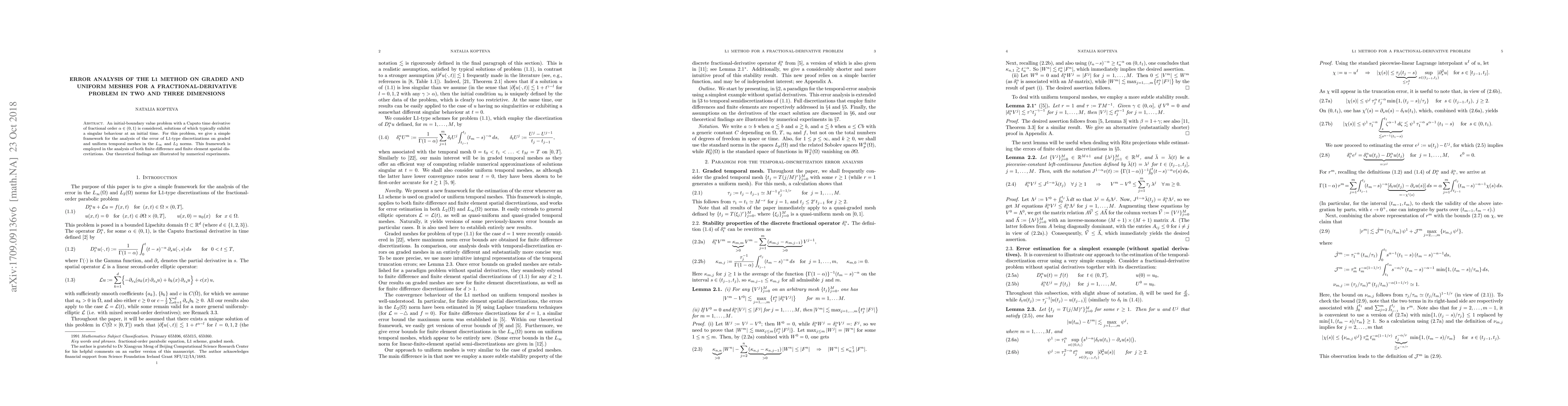 This paper analyzes the error of L1-type discretizations for a fractional-derivative problem with Caputo time derivative, focusing on graded and uniform meshes in $L_\infty$ and $L_2$ norms. Theoretical findings are validated through numerical experiments for both finite difference and finite element spatial discretizations.