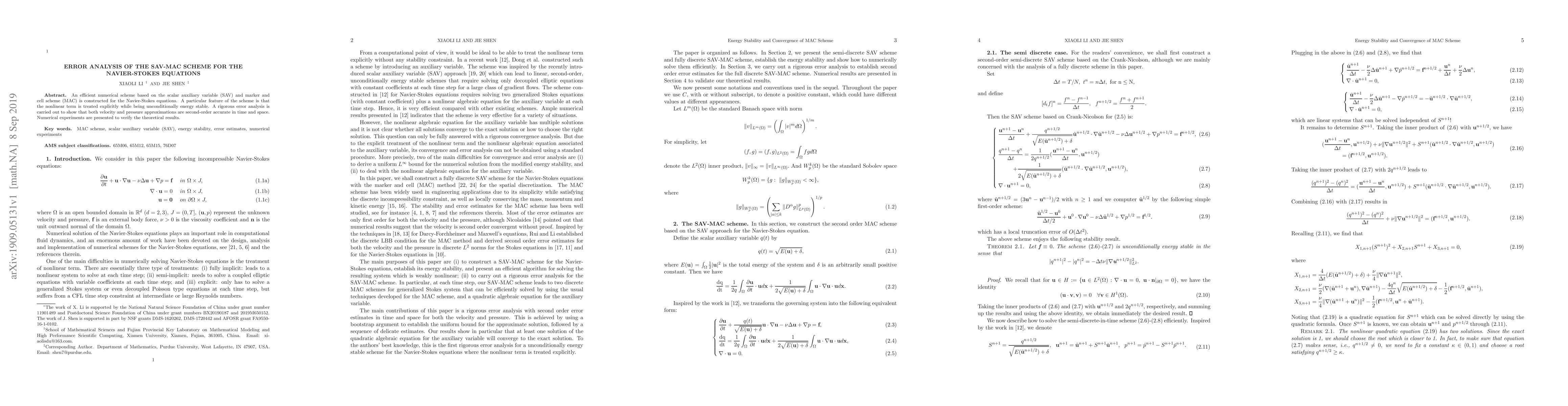 An efficient numerical scheme based on the scalar auxiliary variable (SAV) and marker and cell scheme (MAC) is constructed for the Navier-Stokes equations. A particular feature of the scheme is that the nonlinear term is treated explicitly while being unconditionally energy stable. A rigorous error analysis is carried out to show that both velocity and pressure approximations are second-order accurate in time and space. Numerical experiments are presented to verify the theoretical results.