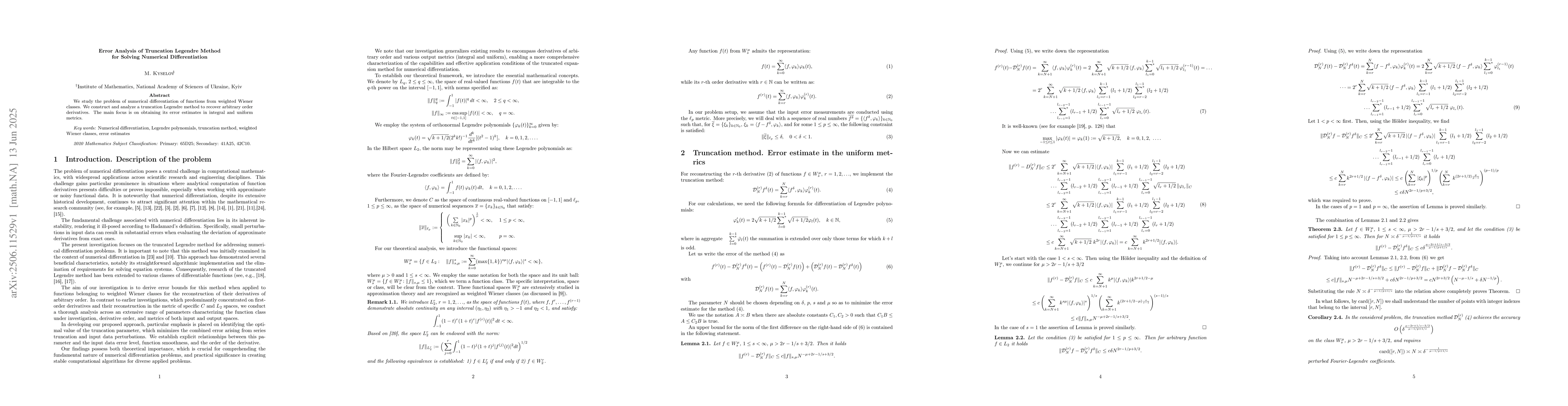 We study the problem of numerical differentiation of functions from weighted Wiener classes. We construct and analyze a truncation Legendre method to recover arbitrary order derivatives. The main focus is on obtaining error estimates in integral and uniform metrics. Unlike previous studies, which predominantly focused on first-order derivatives and specific functional spaces, we conduct a comprehensive analysis across a wide spectrum of function regularity parameters and various metrics for measuring errors. We establish precise error bounds for the truncation method in the metrics of C and L_q for 2 less than or equal to q less than or equal to infinity, and determine optimal truncation parameters as functions of the error level and smoothness parameters. Our results demonstrate that the truncation method achieves optimal convergence rates on weighted Wiener classes, requiring an optimal number of perturbed Fourier-Legendre coefficients for effective derivative recovery.