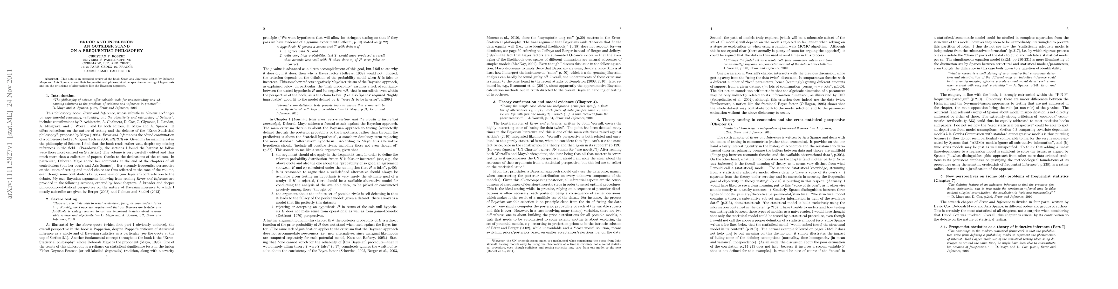 This note is an extended review of the book Error and Inference, edited by Deborah Mayo and Aris Spanos, about their frequentist and philosophical perspective on testing of hypothesis and on the criticisms of alternatives like the Bayesian approach.