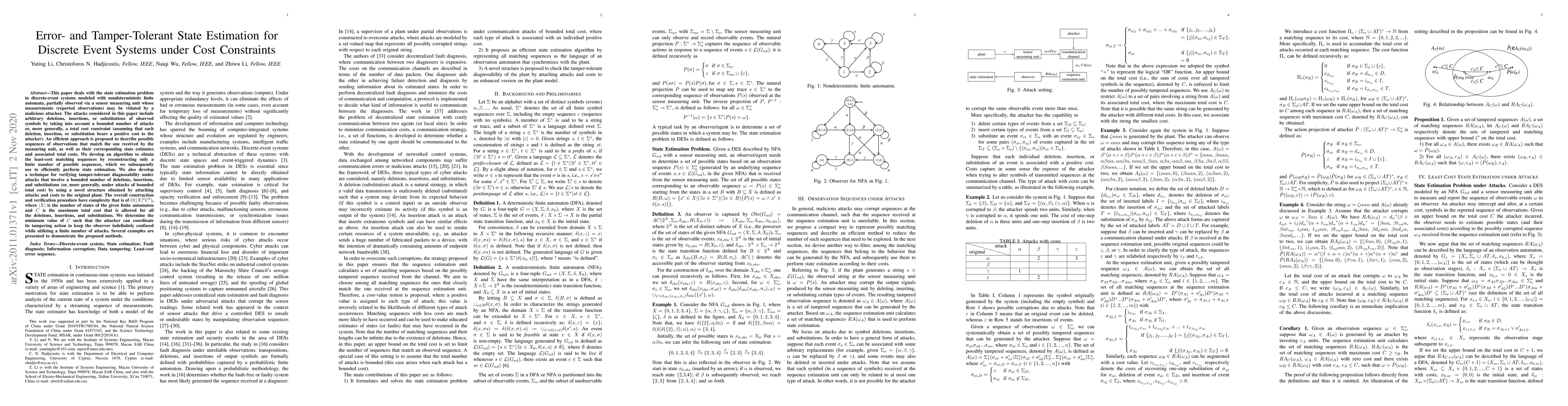 This paper proposes an error- and tamper-tolerant state estimation method for discrete-event systems under cost constraints, addressing attacks that can delete, insert, or substitute observations. It develops an efficient algorithm to reconstruct minimal cost observation sequences and verifies tamper-tolerant diagnosability, with a complexity of O(|X|^2C^2).