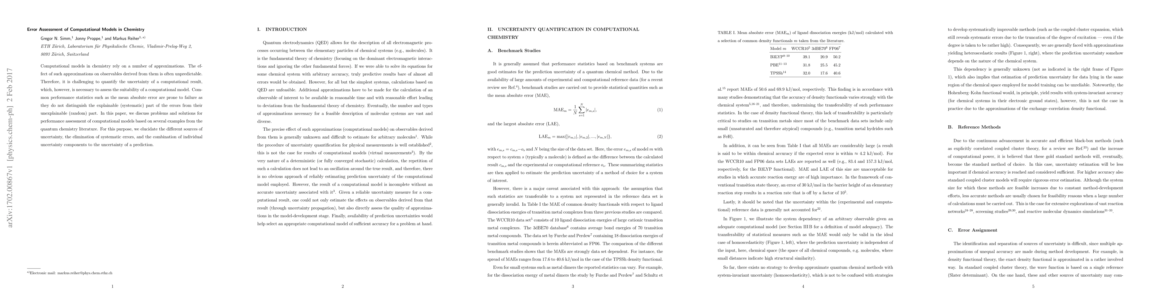 This paper discusses the challenges in quantifying uncertainties in computational chemistry models due to unpredictable approximations and the limitations of common performance metrics. It proposes solutions for assessing model performance by distinguishing between systematic and random errors, and combining these uncertainties for accurate predictions.